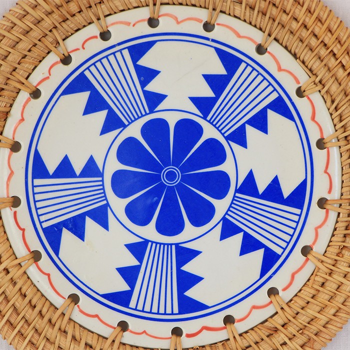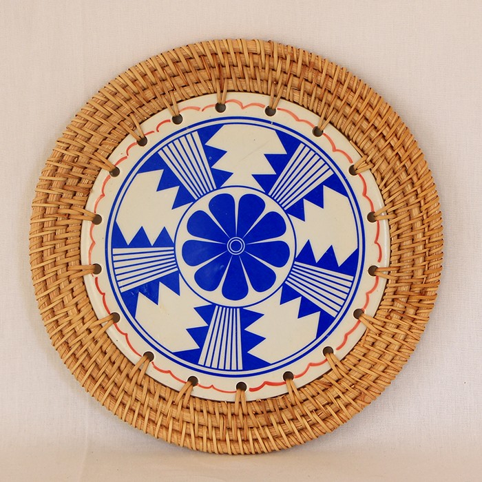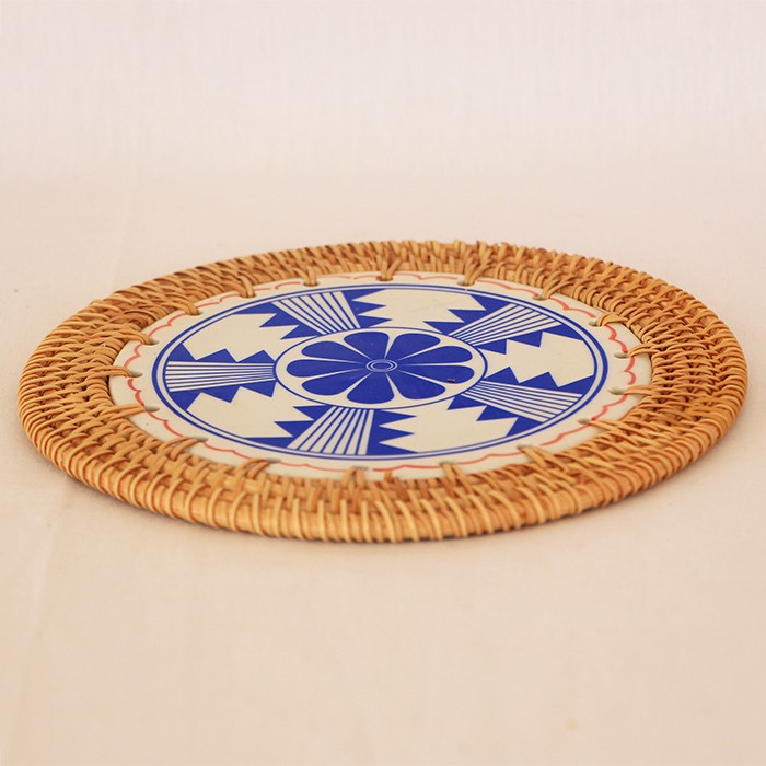 Rattan Çerçeveli 20 cm. Mavi Çiçek ve Geometrik Desenli Dekoratif Obje & Nihale