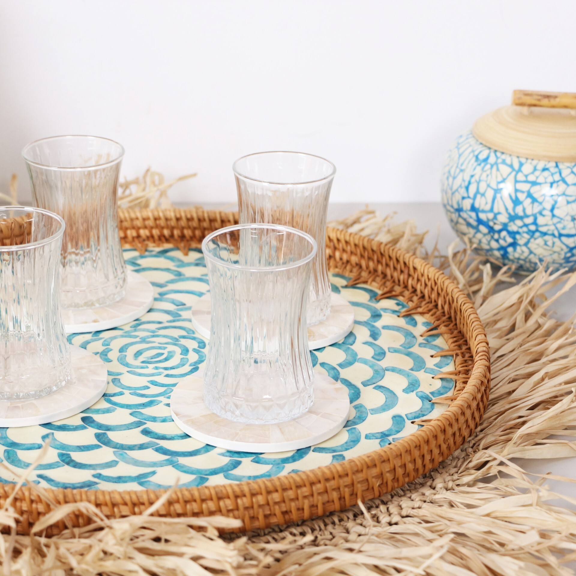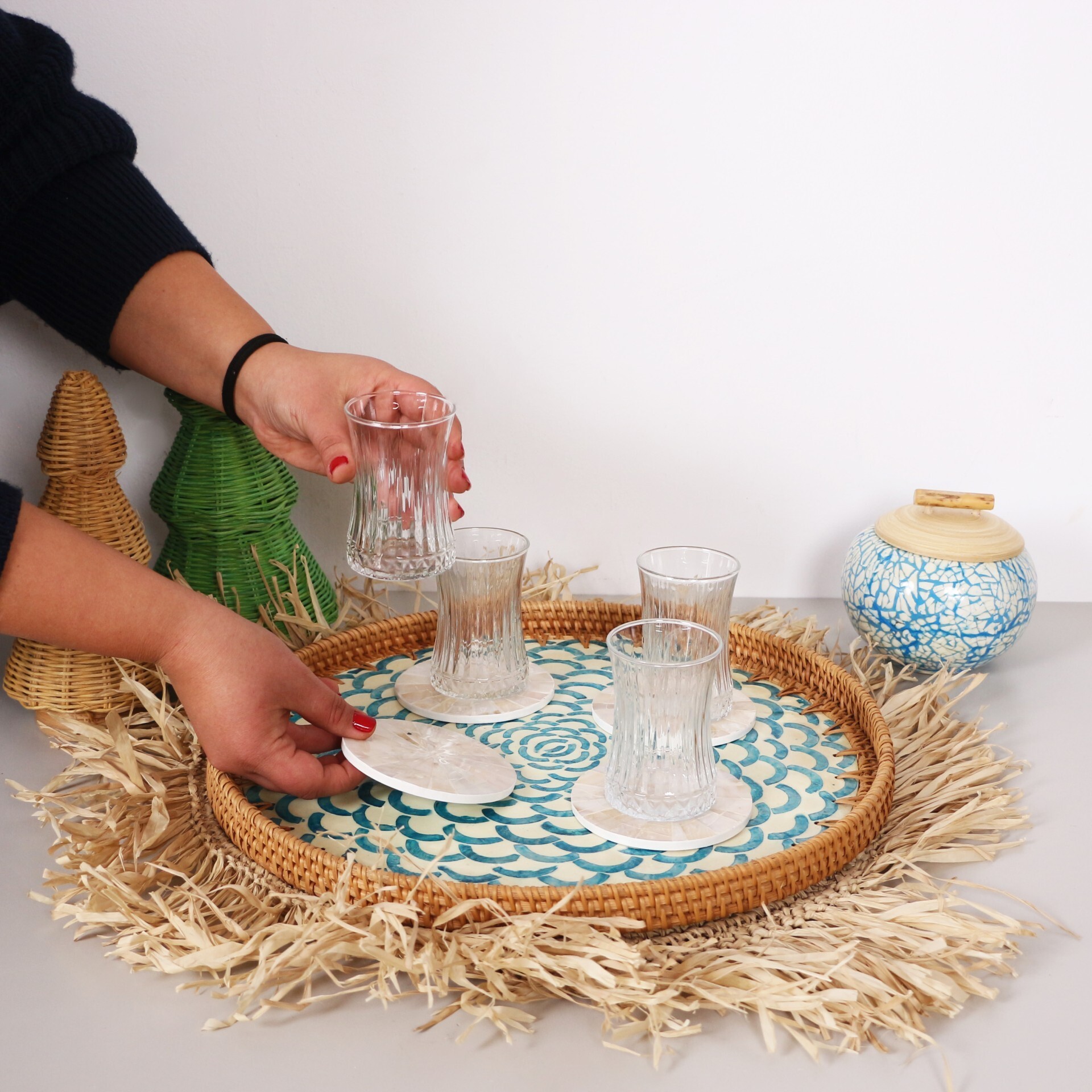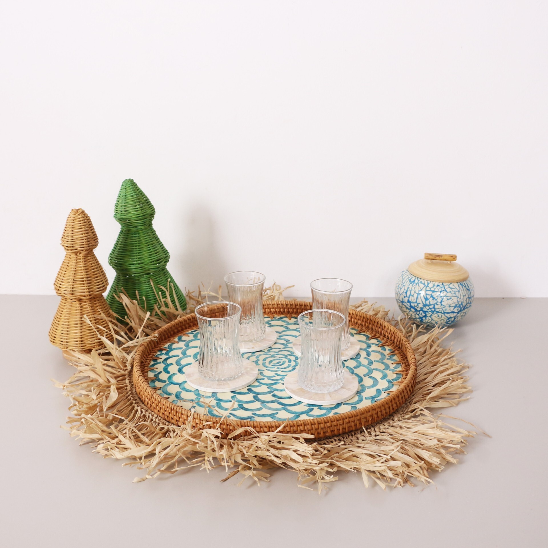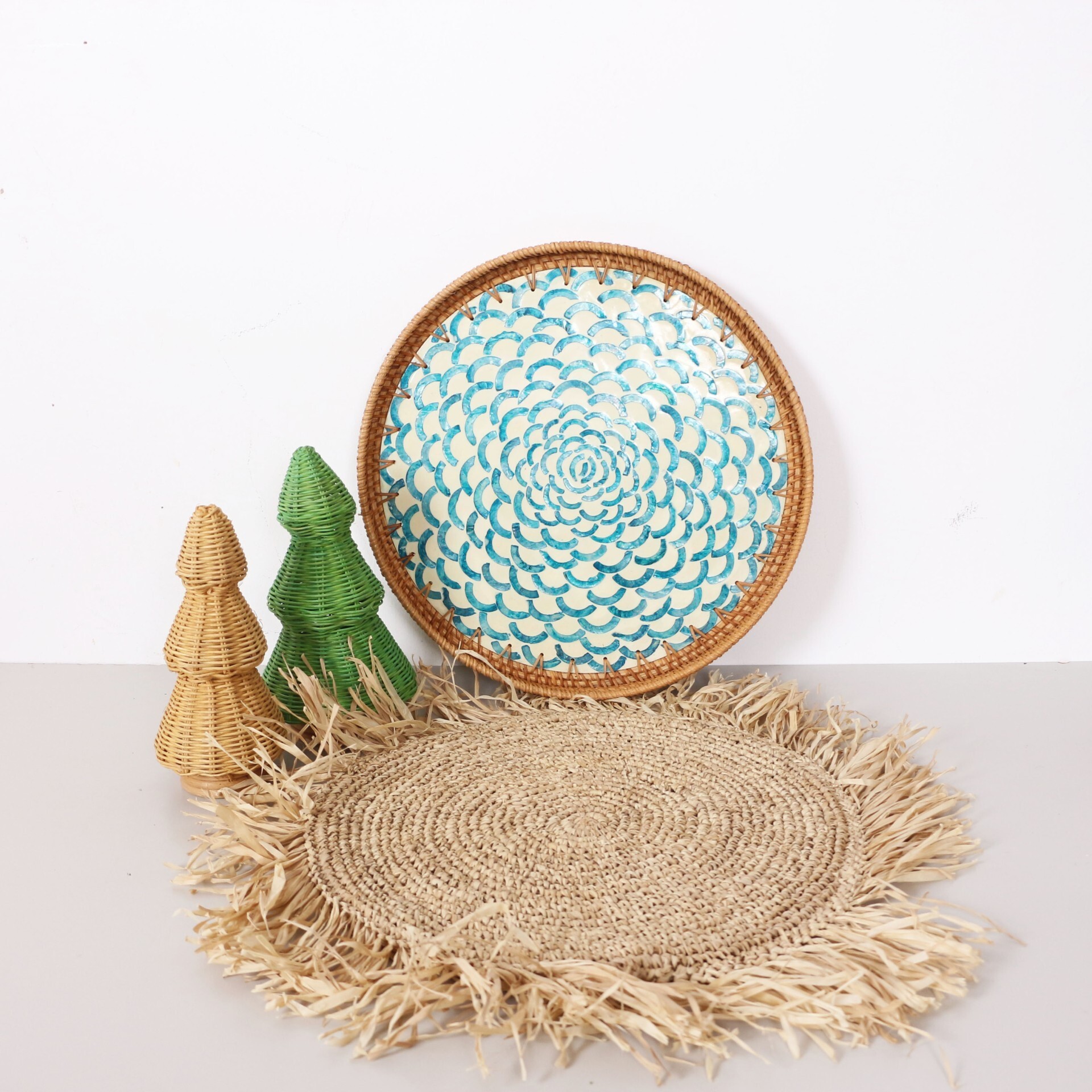 - Rattan ve sedefli mozaikten el işiliği ile üretilmiştir.