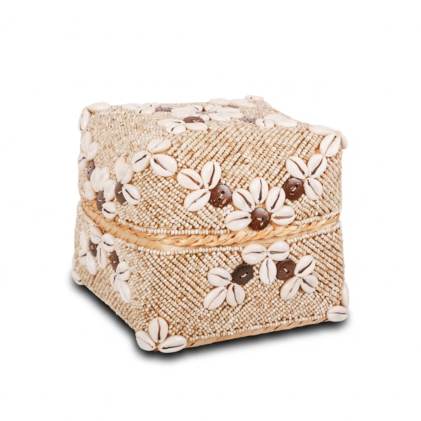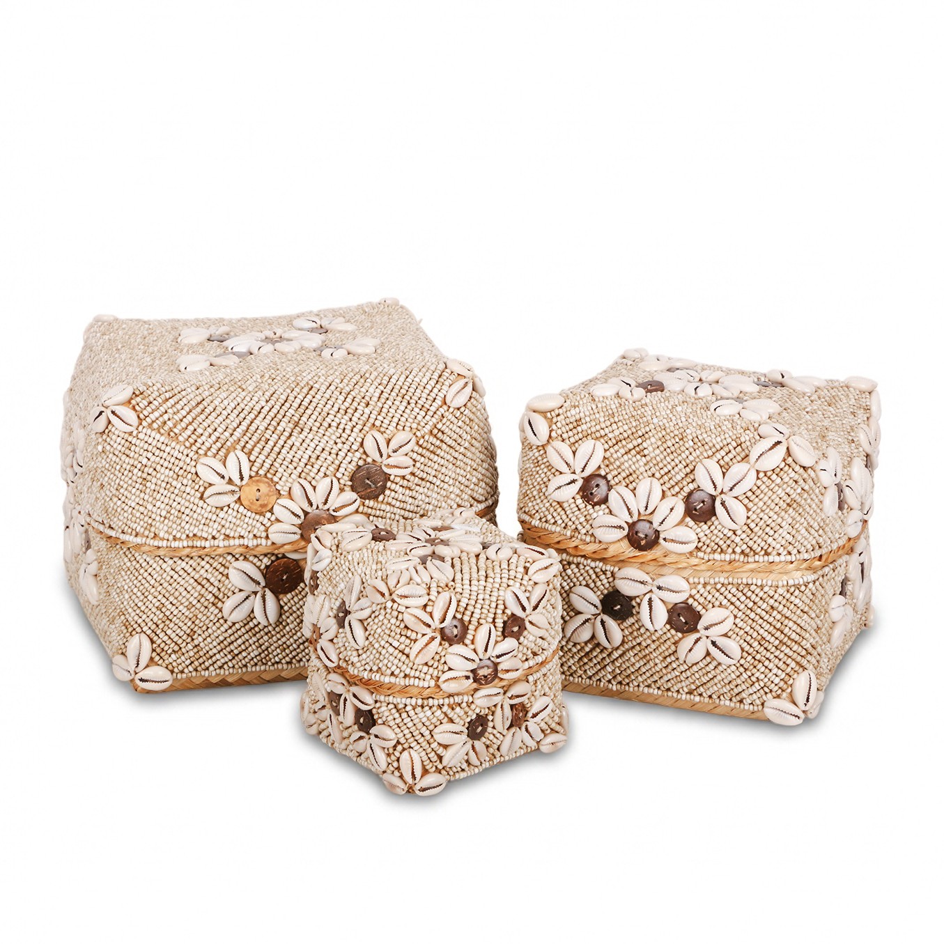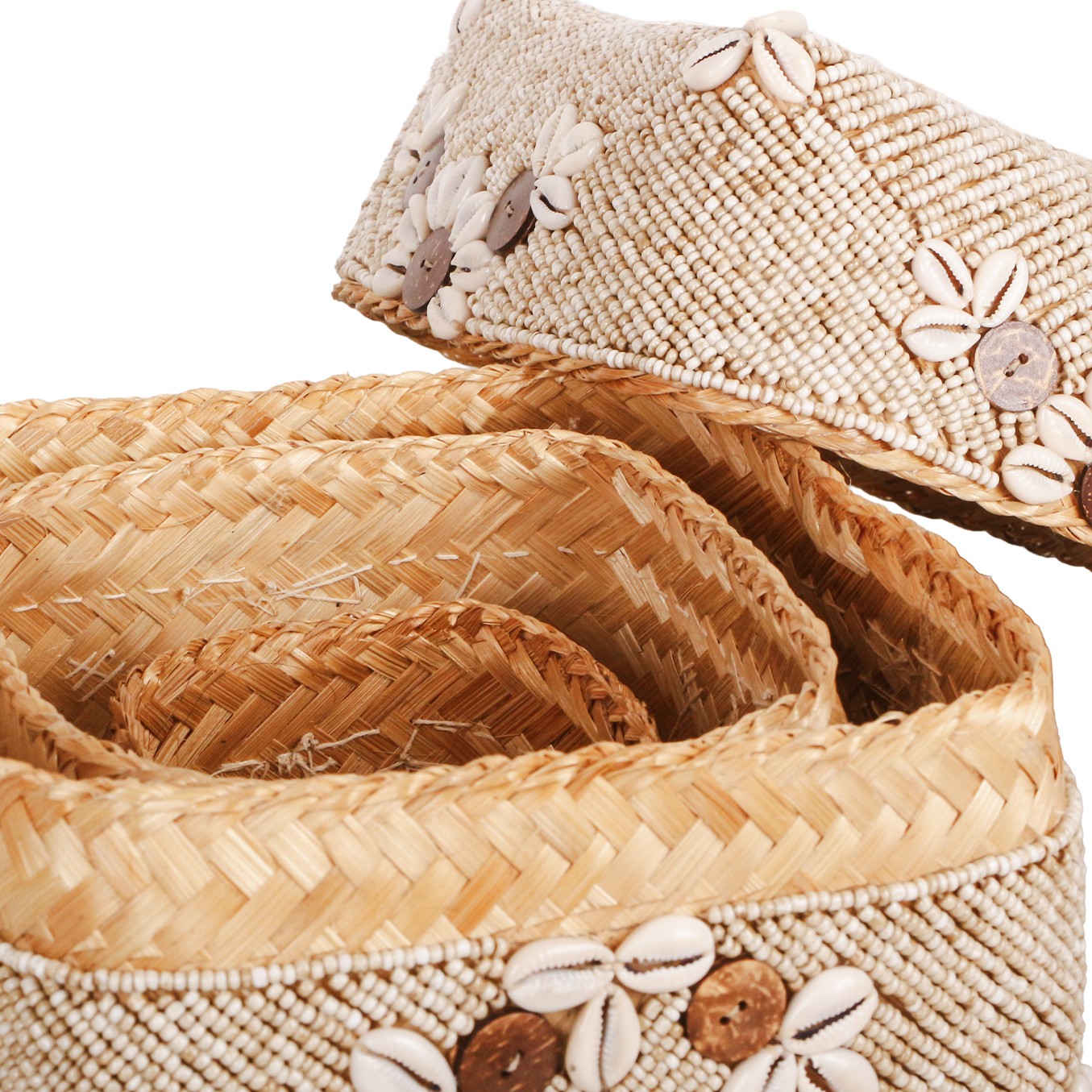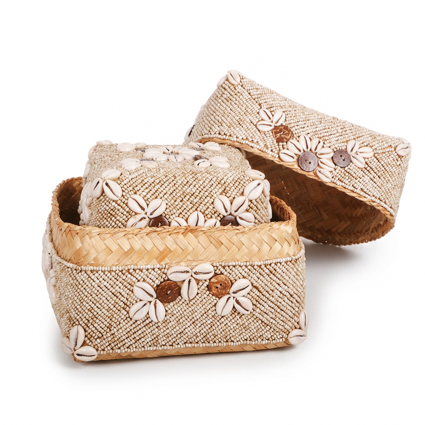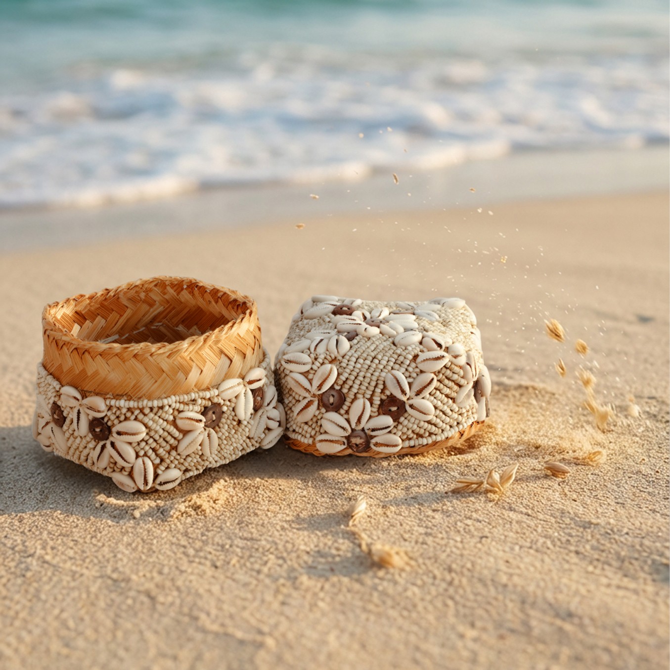 Setin her parçası, dayanıklı bambu veya doğal liflerin sıkı bir örgü tekniğiyle tamamen el işçiliğiyle üretilmiştir. Kutuların kapak ve yan yüzeyleri, geleneksel Bali el sanatlarından ilham alan yoğun krem/bej tonlu boncuk işçiliği ile kaplanmıştır. Bu boncukların arasına yerleştirilen deniz kabukları (cowrie shell), zarif çiçek motifleri oluşturarak sete doğal ve otantik bir hava katar.