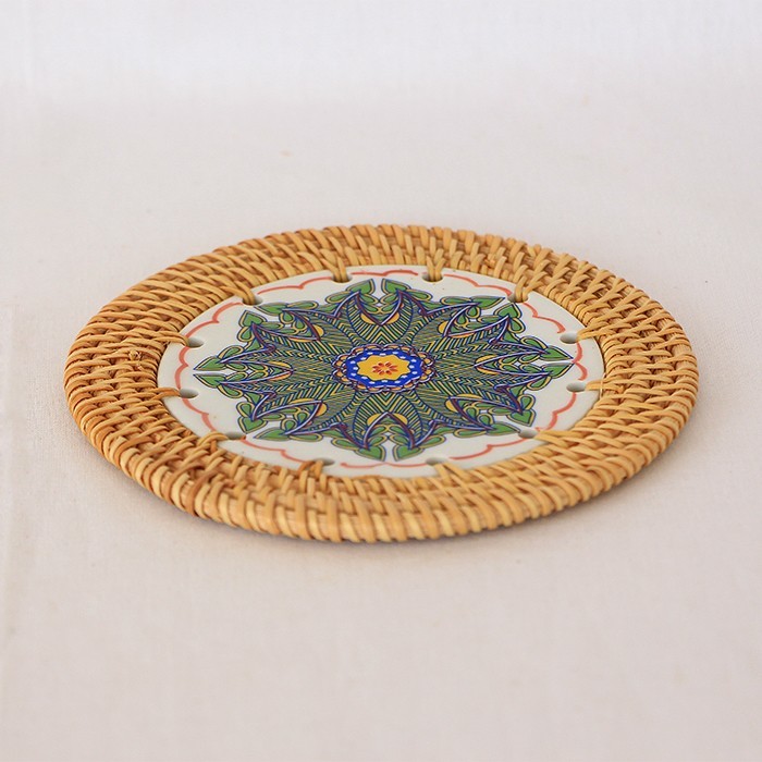 Rattan Çerçeveli 14 cm. Mandala Motifli Renkli Dekoratif Obje