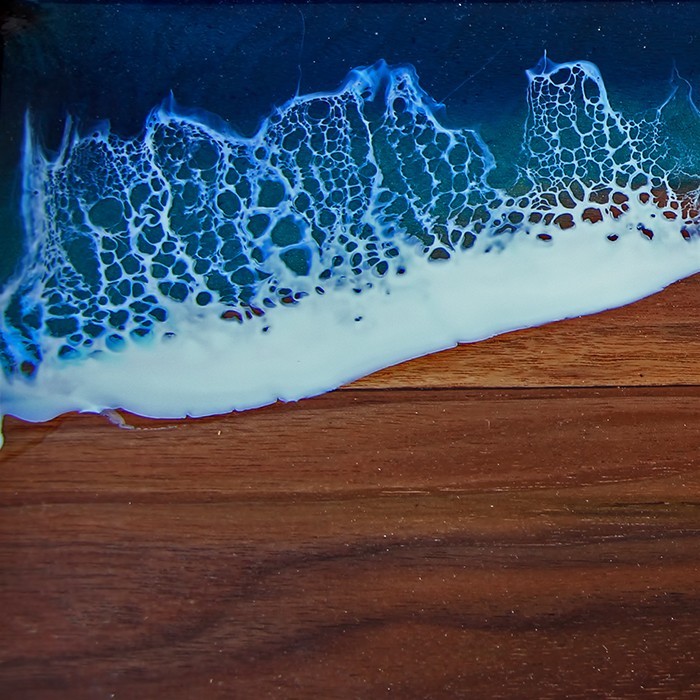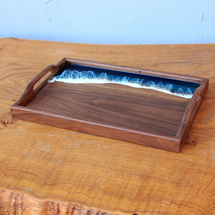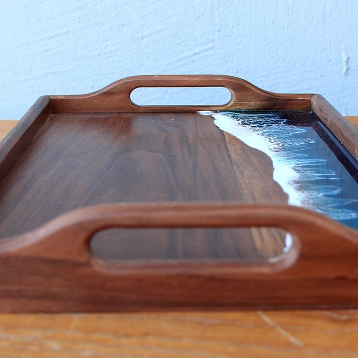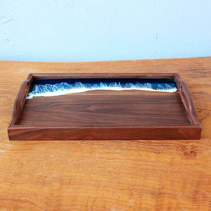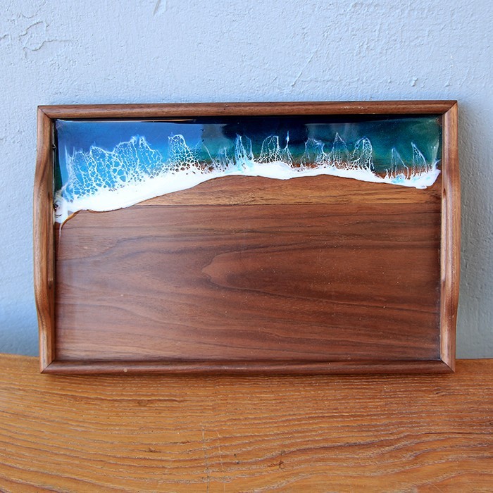 Epoksi ile tepside kabartma şeklinde deniz ve sahil şekli el işçiliği ile verilmiştir.