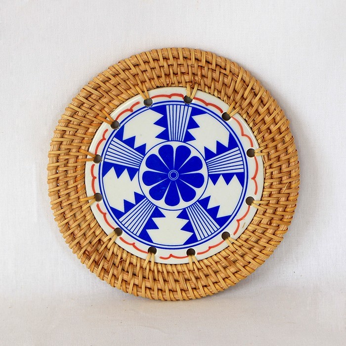 Rattan Çerçeveli 14 cm. Mavi Çiçek & Çizgi Desenli Dekoratif Obje