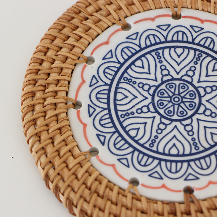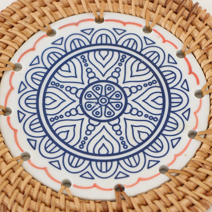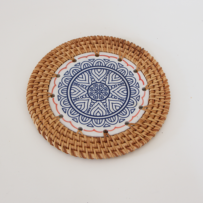 Rattan Çerçeveli 14 cm. Mavi Motifli Dekoratif Obje