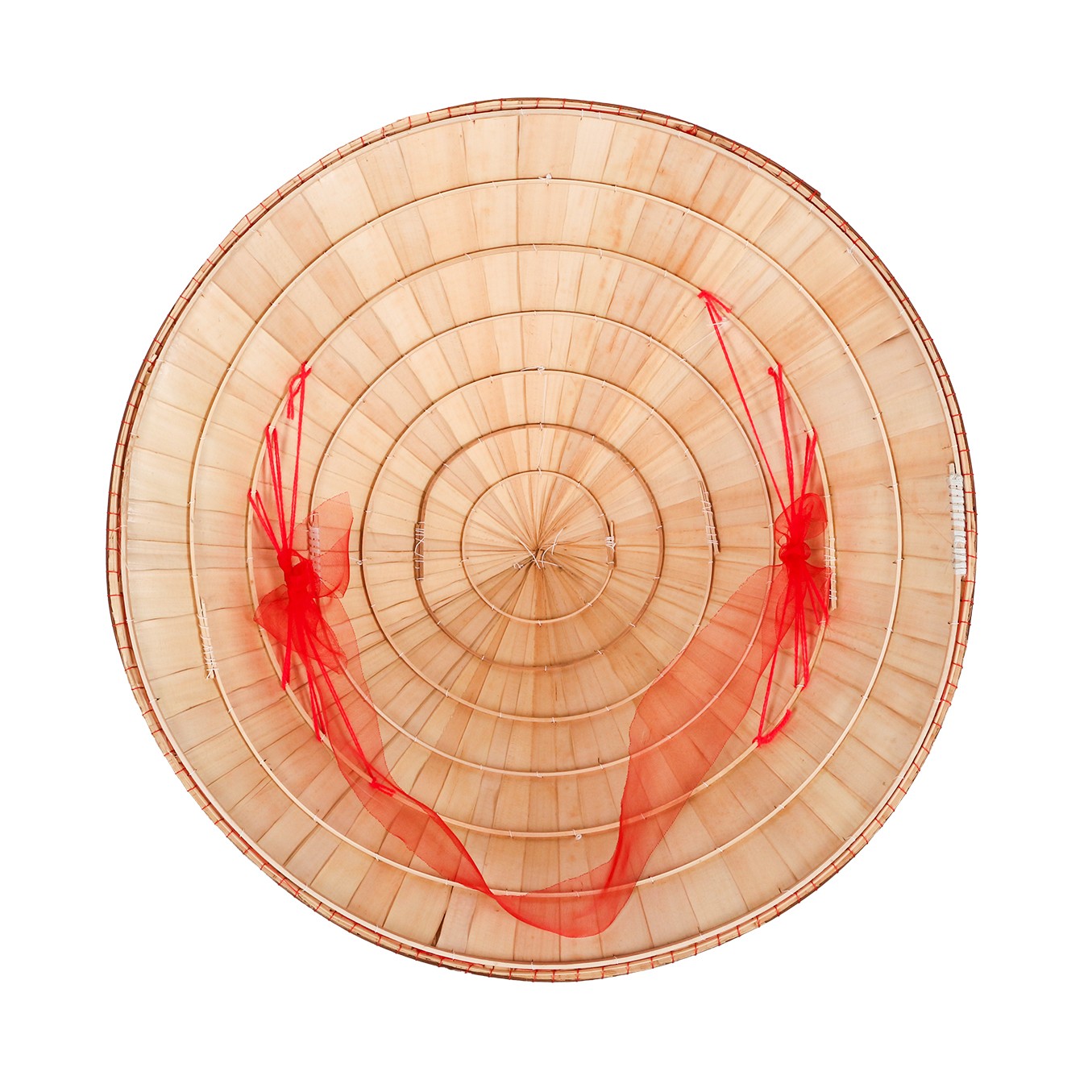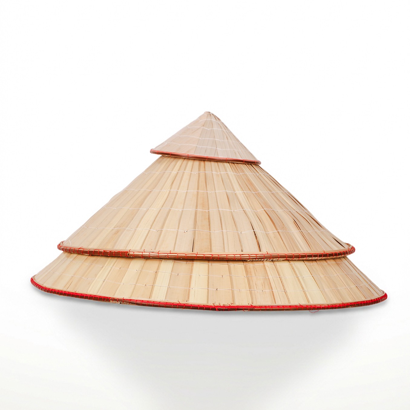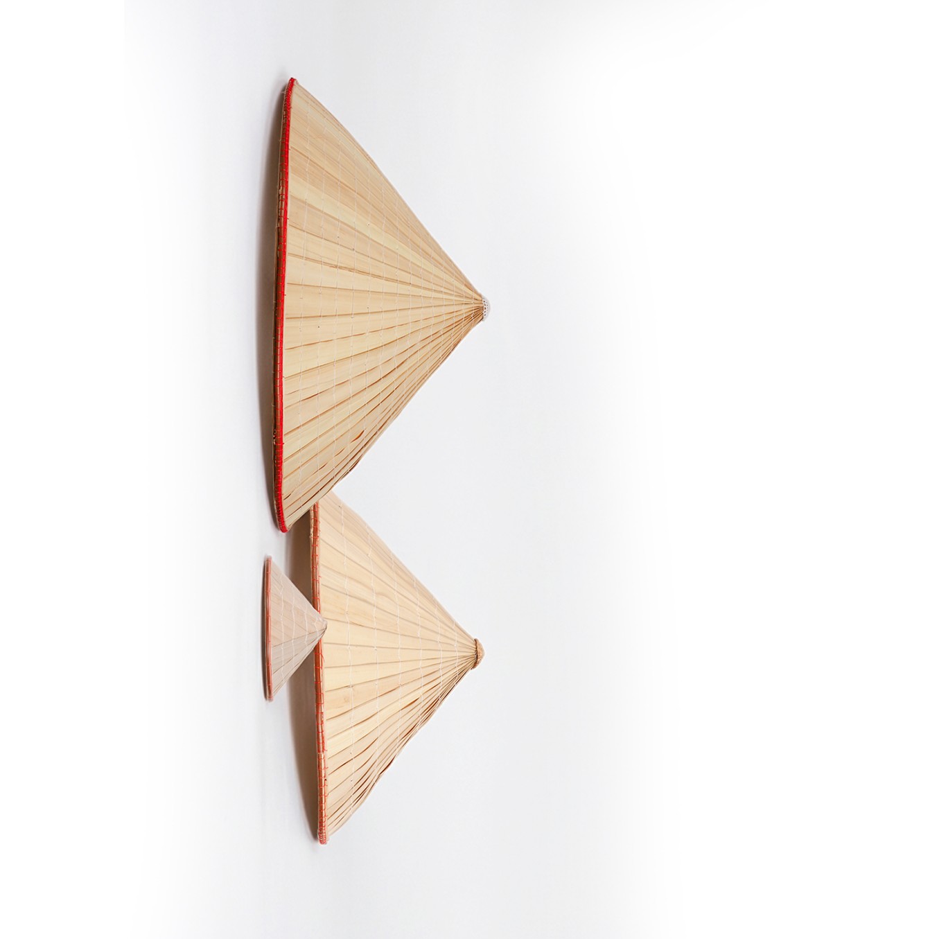ölçülerine sahip üç adet konik şapkadan oluşuyor. Her biri geleneksel tekniklerle işlenmiş, doğal bambu liflerinin tek tek dokunmasıyla hafif ama dayanıklı bir yapı elde edilmiş.