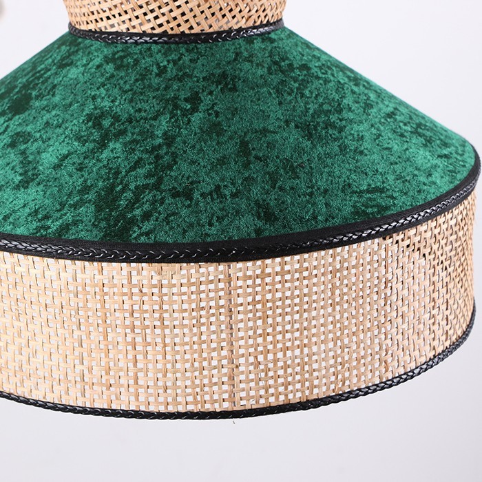 - İmalat Ürünümüz; doğal hazeran malzemeden ve pvc tabanlı ışık geçirgenliği olan kadife abajur kumaşından, statik boyalı tel üzerine el işçiliği ile üretilmiştir..