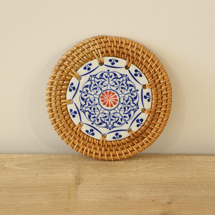 Rattan Çerçeveli 12 cm. Kırmızı & Mavi Geometrik Desenli Dekoratif Obje