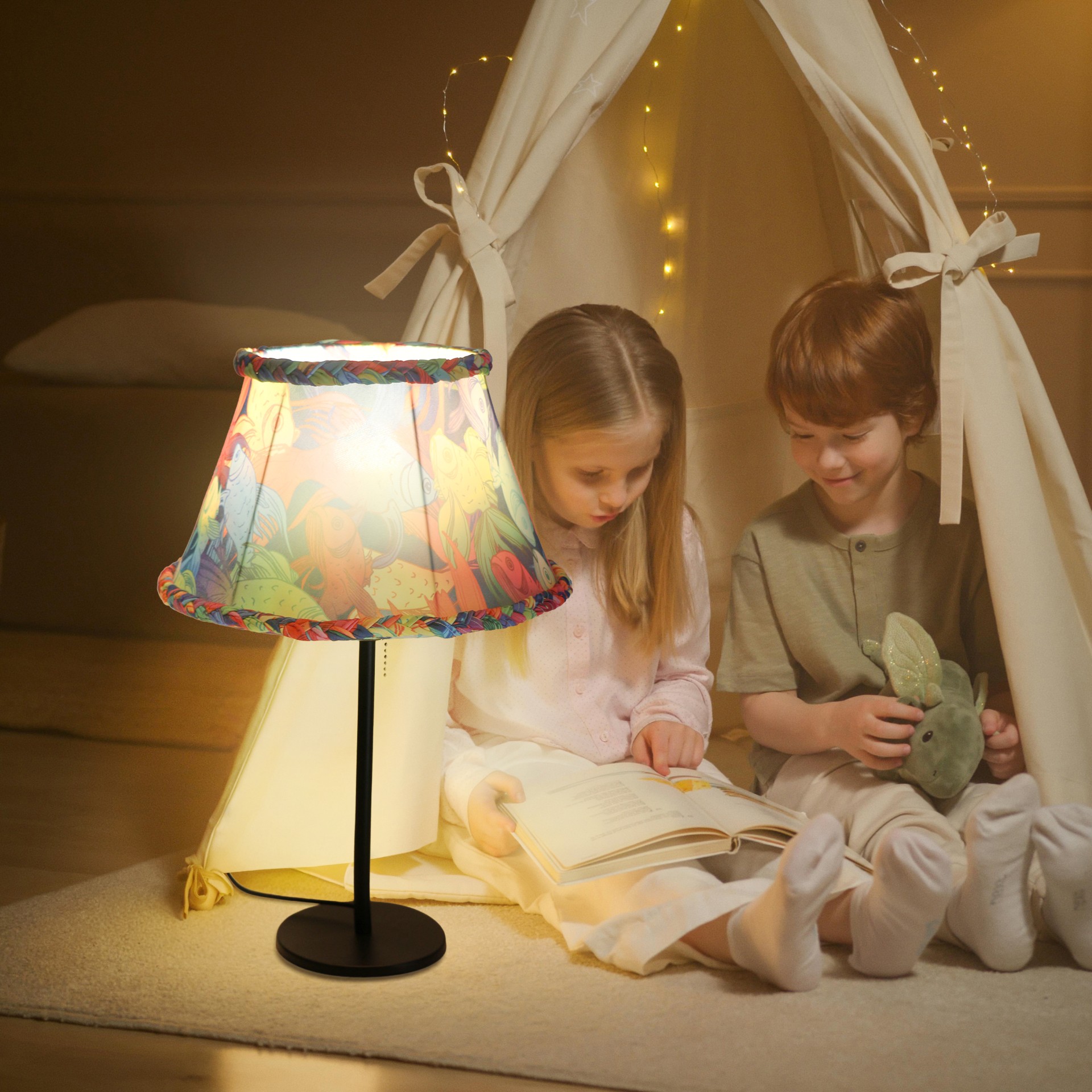 Rüya Renkli Likralı Kumaş Masa Lambası, canlı desenleri ve esnek likralı kumaşıyla mekânınıza neşeli bir hava katar. Zincir çekme anahtarı, kullanımı kolay ve nostaljik bir açma-kapama deneyimi sunar.
