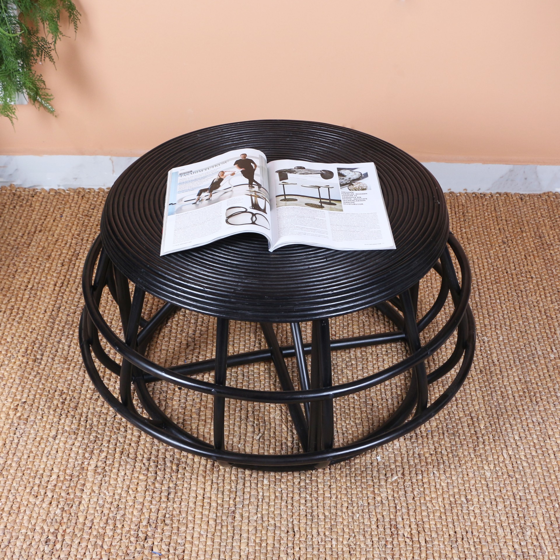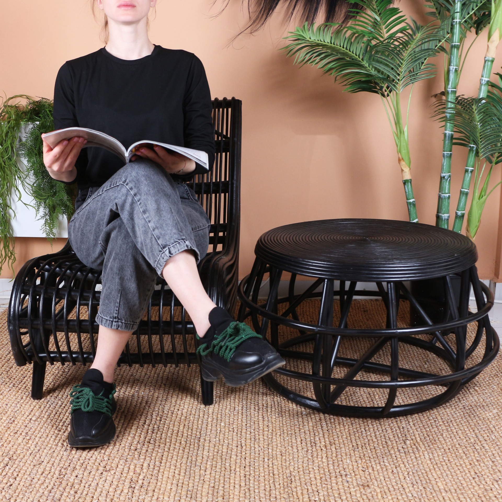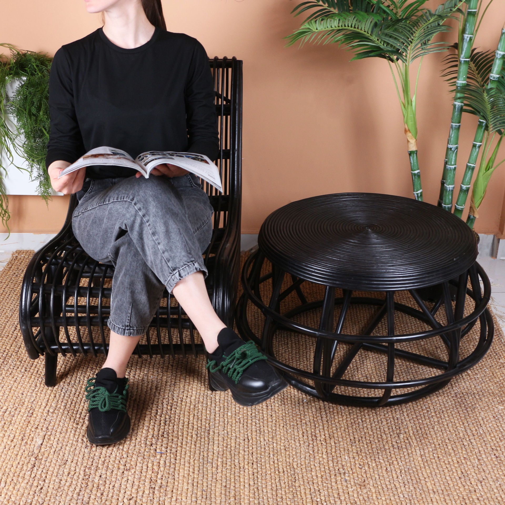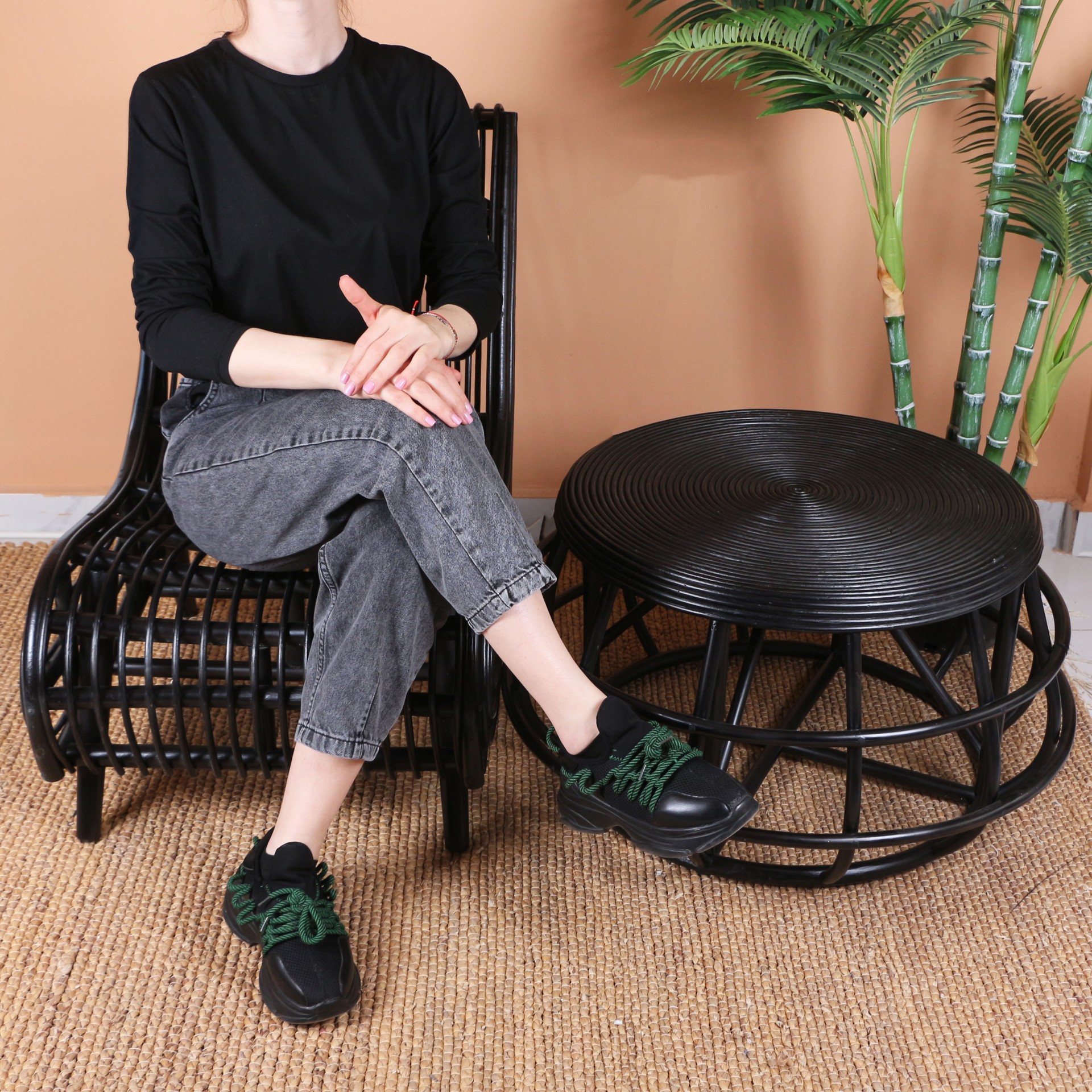 - Doğal Rattan'dan el işçiliği ile imal edilmiştir. Taban ayak ksıımlarında yer ile teması kesen plastik pabuçlar vardır.