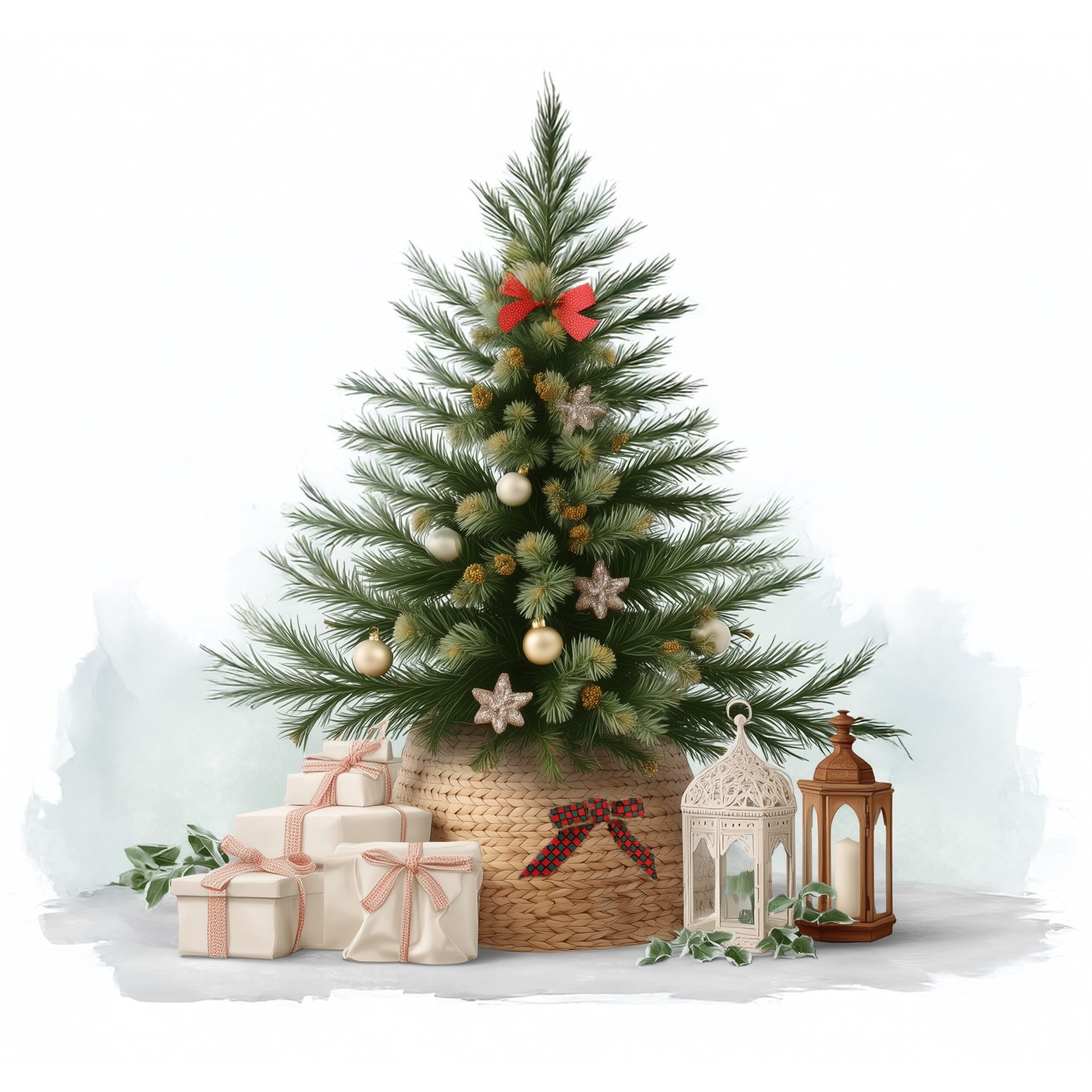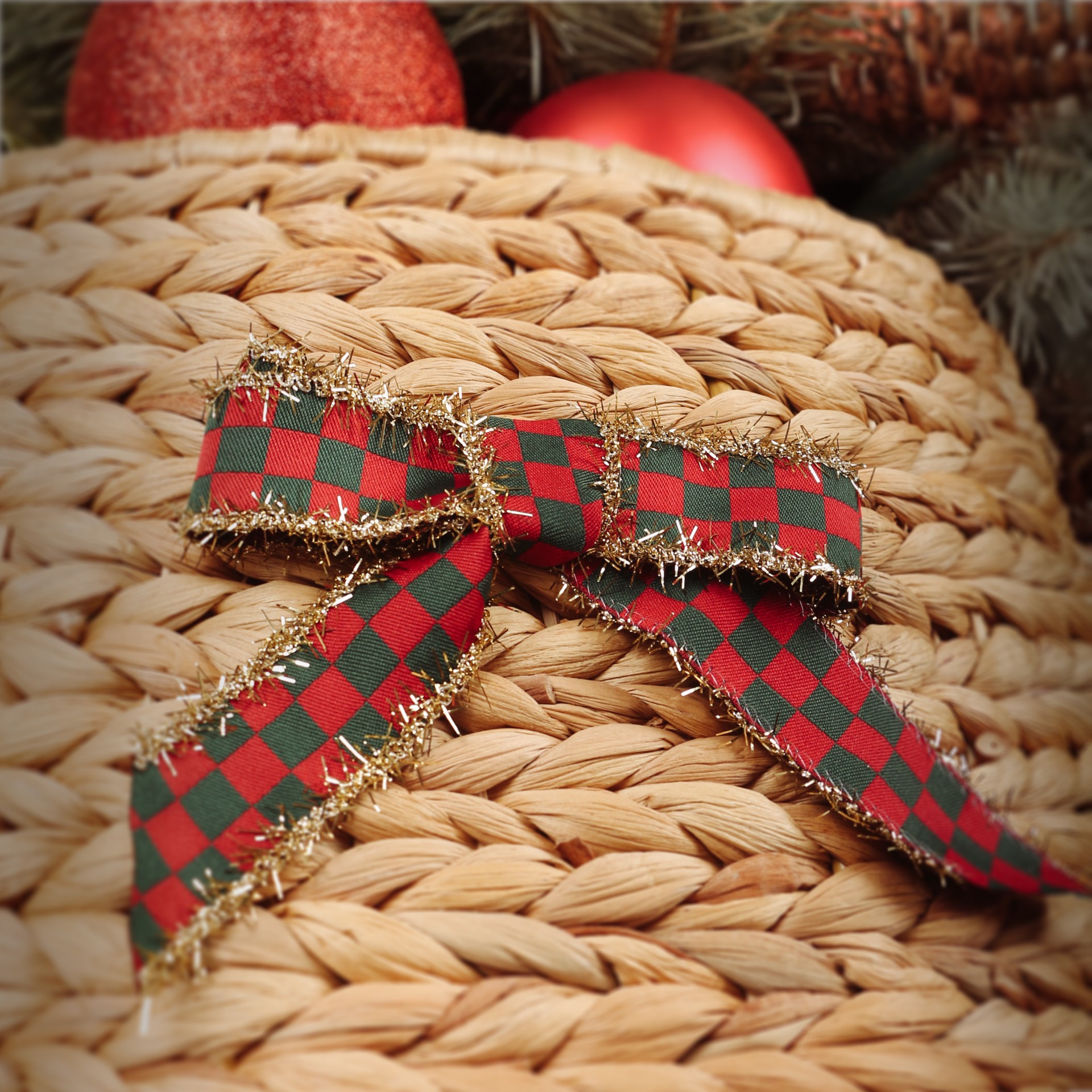 Üzerindeki kırmızı-yeşil desenli kumaş kurdele, geleneksel yılbaşı renklerini rustik bir tarzla buluşturur. Altın yaldızlı kenar detayları ışık altında parlayarak hem modern hem de nostaljik bir his verir.
