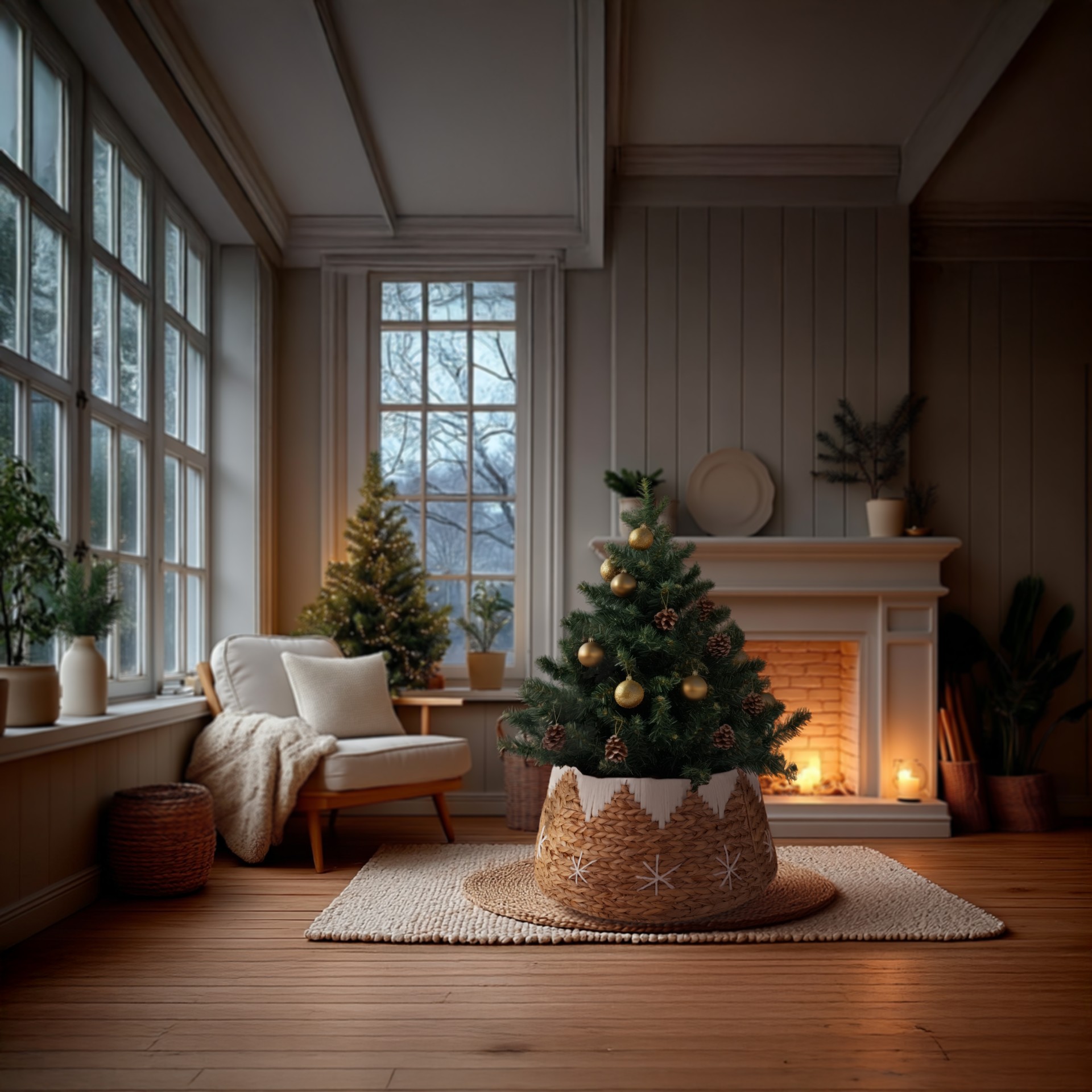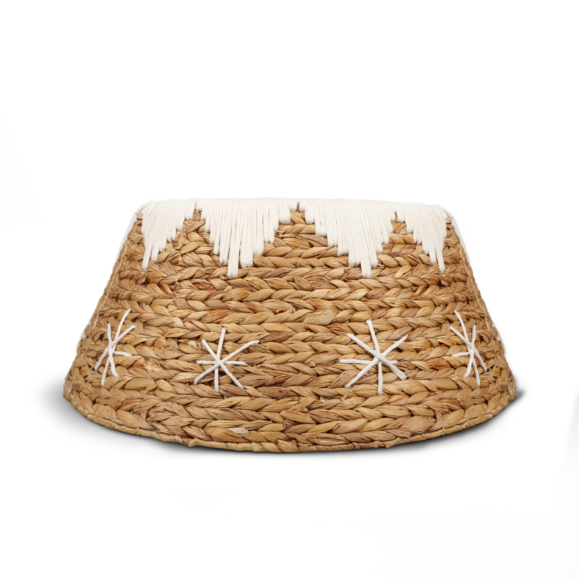 Doğal Su Sümbülü & Makrome Detaylı Yılbaşı Ağacı Eteği, doğallığın zarafetini el işçiliğiyle birleştirir. El örgüsü Su Sümbülü lifleri, üst kenarındaki makrome ipi dokusuyla buluşarak her detayıyla sıcak ve bohem bir görünüm oluşturur.