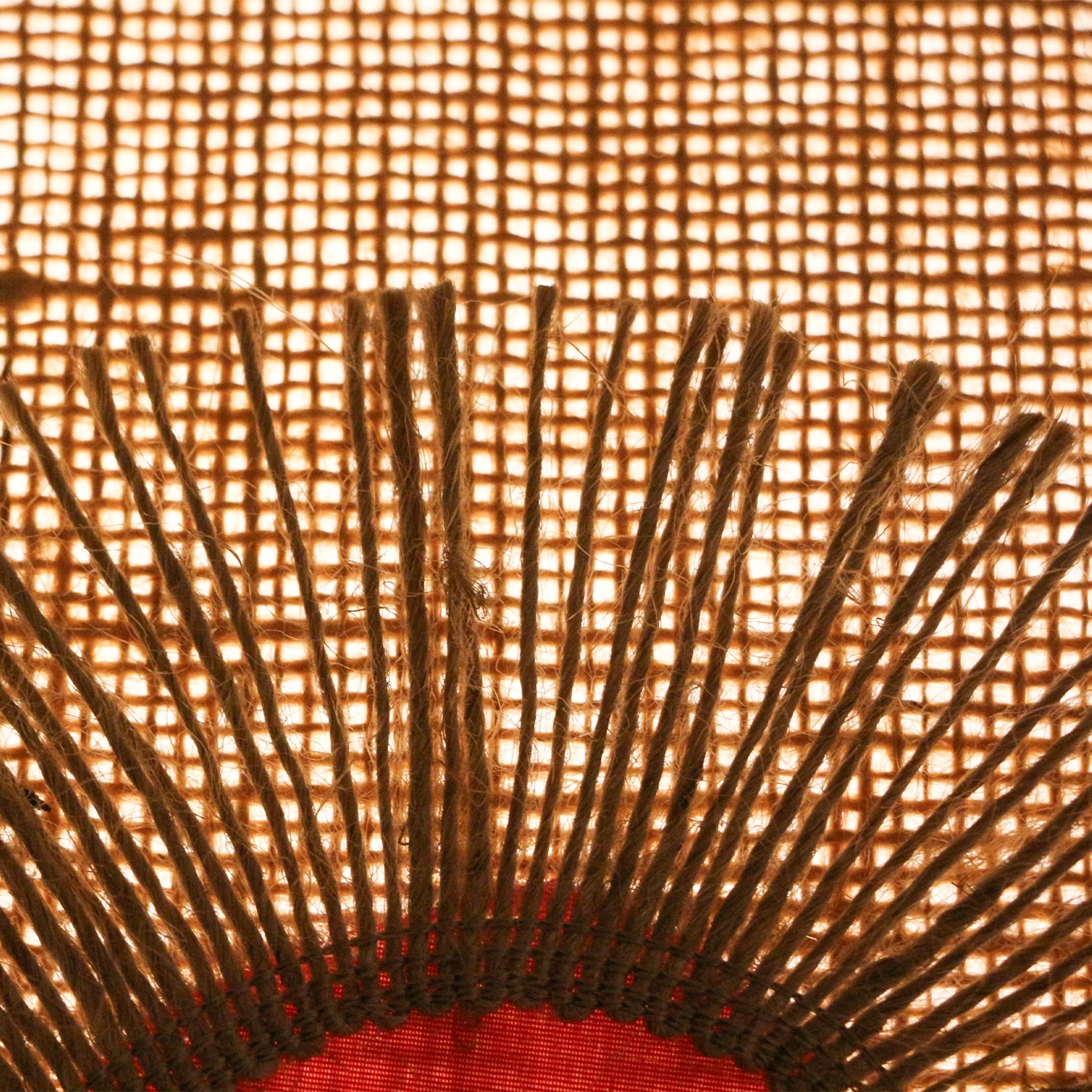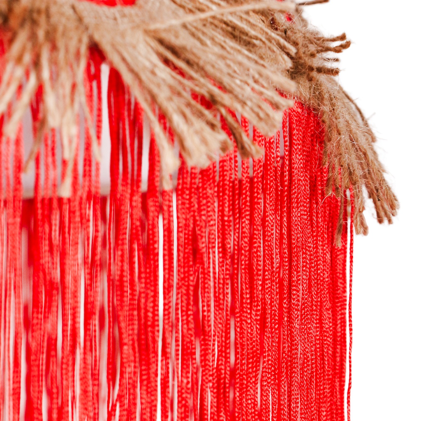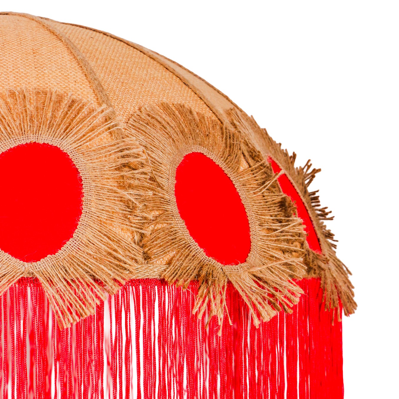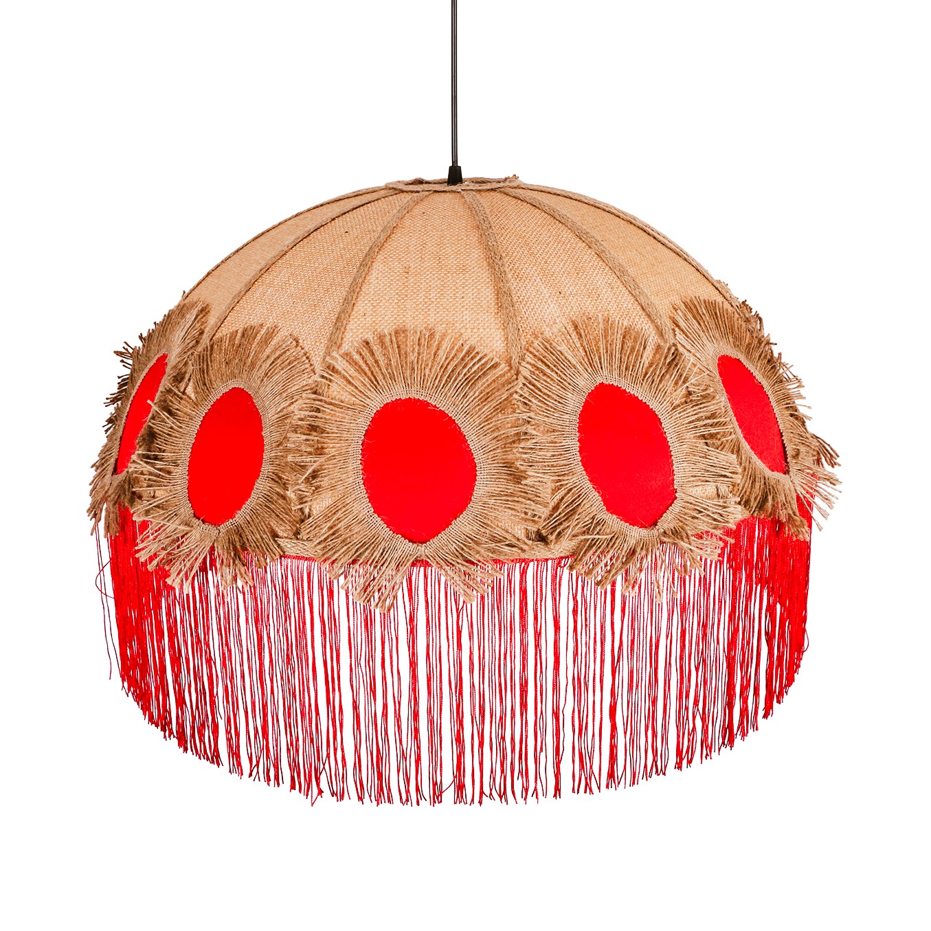 Bu avize, tamamen el işçiliğiyle şekillendirilmiş jüt kumaş gövdesi ve kırmızı kumaş çember detaylarının etrafını saran doğal püskül işlemeleriyle benzersiz bir görünüm sunar. Her parçası ustalıkla işlendiği için standart fabrikasyon ürünlerde bulamayacağınız sıcaklık ve doğallık hissi mekâna kolayca yansır. Doğal jüt dokusunun sıcak tonları ile kırmızının enerjik görünümü şık bir kontrast oluşturarak avizeyi hem modern hem de retro tarz dekorasyonlarda ideal bir tamamlayıcı haline getirir.