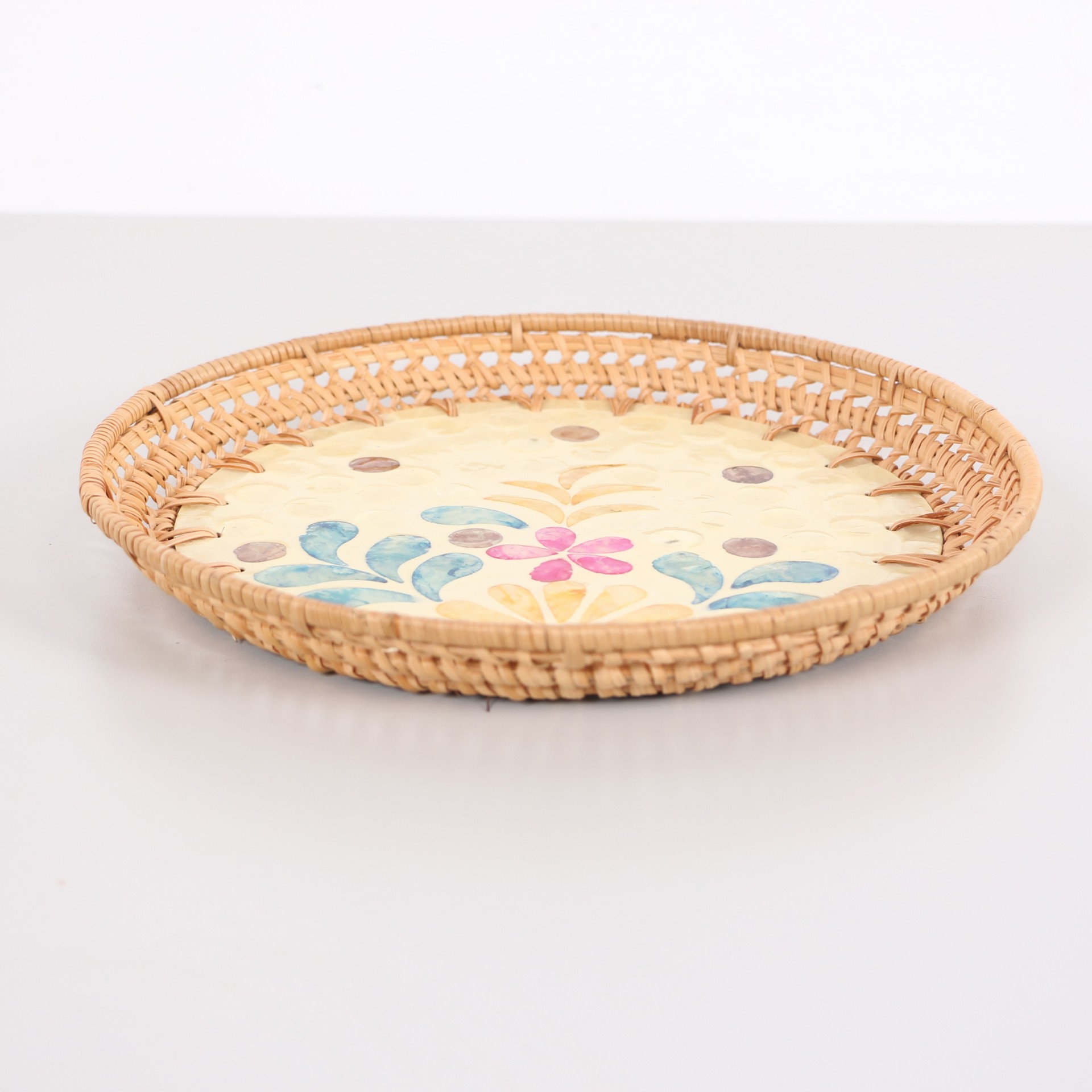 Ürünümüzde Doğal Rattan kullanılarak zanaatkar ustalarımızca el işçiliği ile örülmüştür. ; Tamamen El yapımı bu ürünlerimizin, yuvarlak ahşap zemindeki derzin üzerine, sedefler dizilerek kurumaya bırakılmakta ve her bir tabak kuruduktan sonra üzerine vernik atılarak zeminin korunması sağlanmıştır. Kenarlarına doğal rattan çevrilerek yine doğal ince rattan ile kenar kısımlarında bağlantı yapılmıştır.