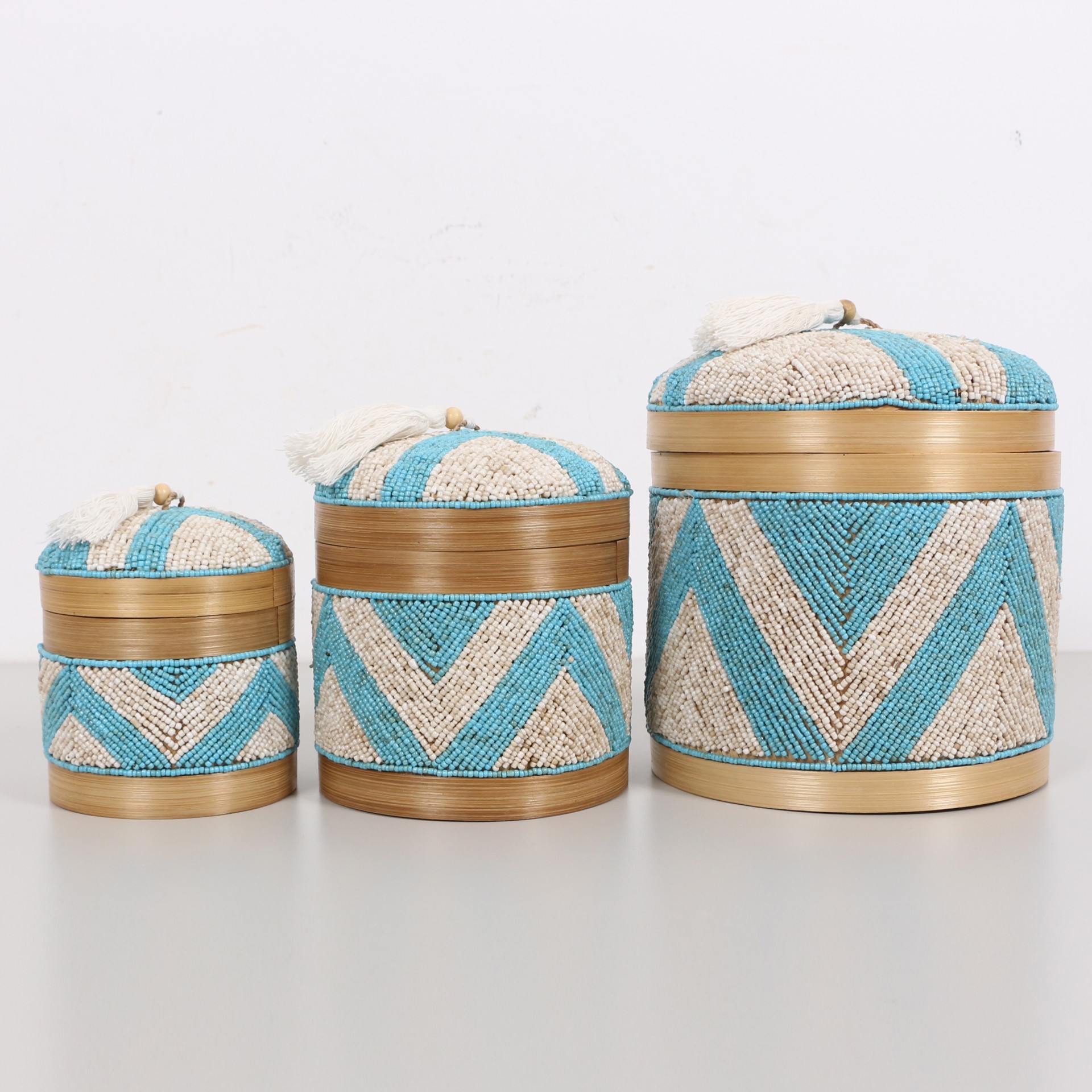 - Doğal Bambunun dış kabuğundan el işçiliği ile örülmüştür. Minik Cam boncuklarla farklı desen ve renklerde bambu kutunun üzerinde el işçiliği ile dekor verilerek, kapak kısmında püskülle tamamlanmıştır.