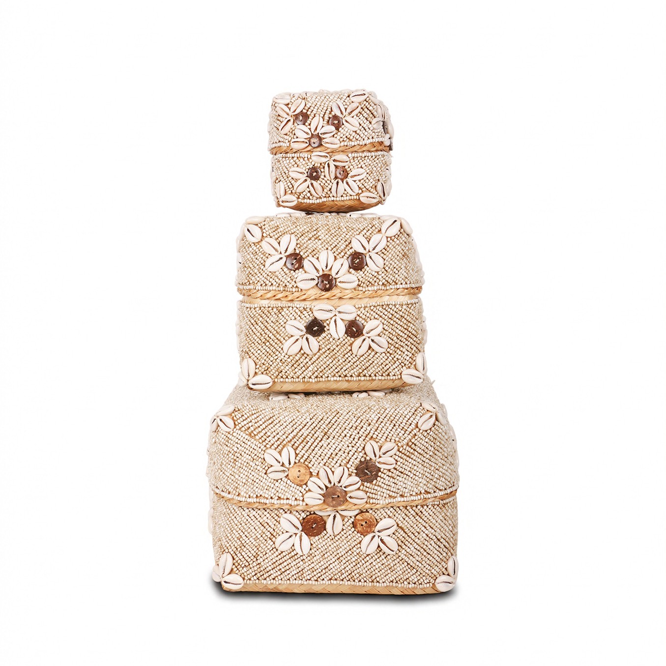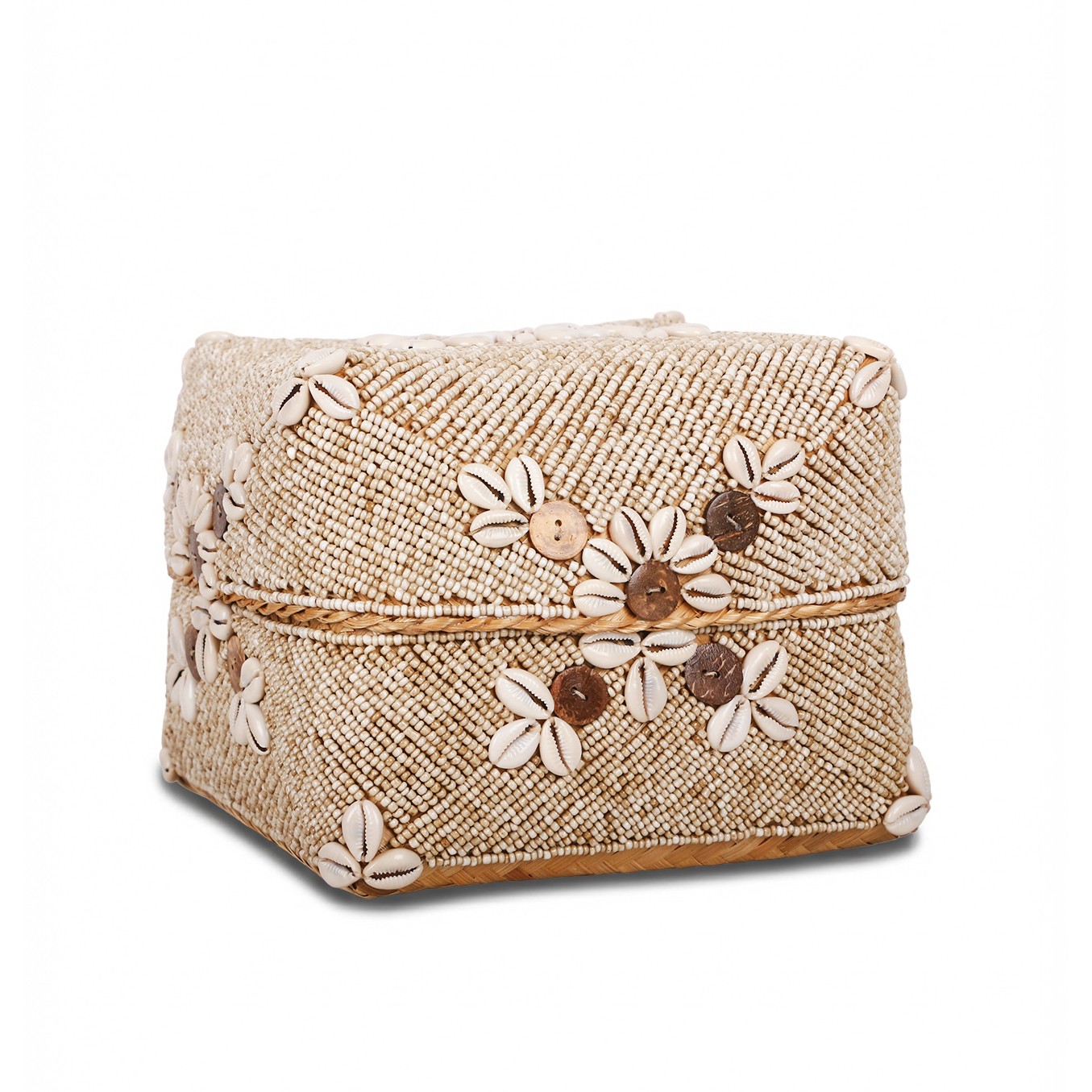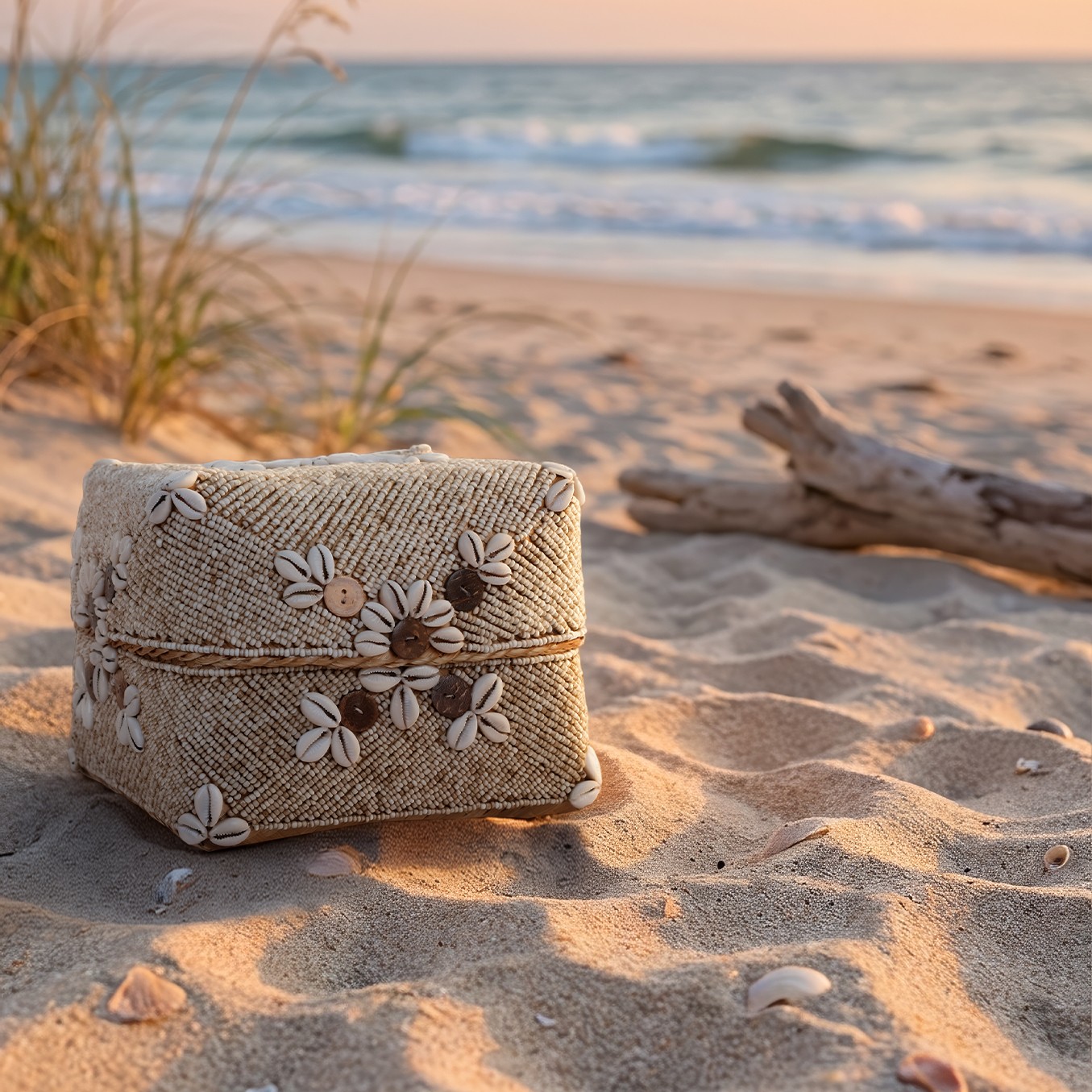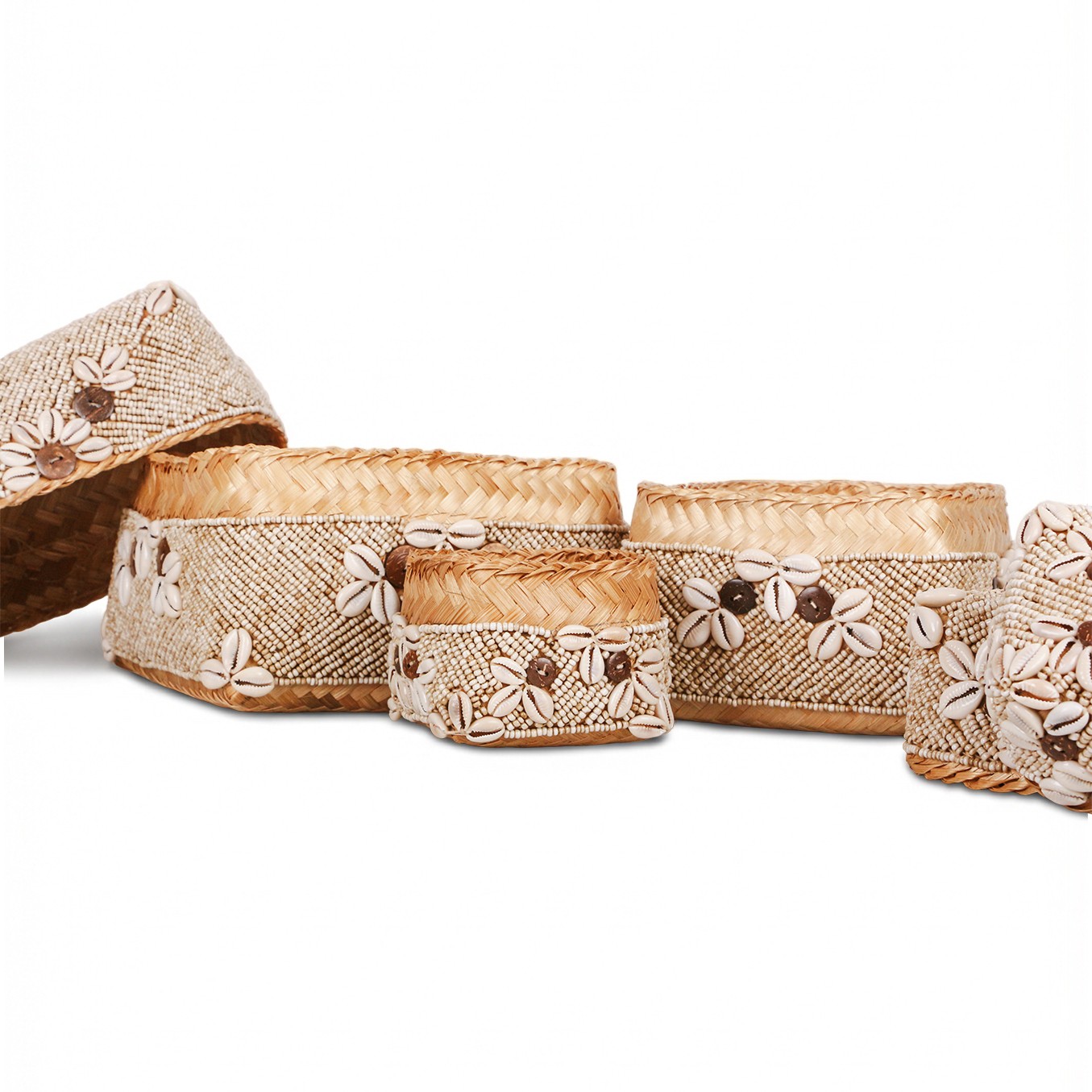 Setin her parçası, dayanıklı bambu veya doğal liflerin sıkı bir örgü tekniğiyle tamamen el işçiliğiyle üretilmiştir. Kutuların kapak ve yan yüzeyleri, geleneksel Bali el sanatlarından ilham alan yoğun krem/bej tonlu boncuk işçiliği ile kaplanmıştır. Bu boncukların arasına yerleştirilen deniz kabukları (cowrie shell), zarif çiçek motifleri oluşturarak sete doğal ve otantik bir hava katar.