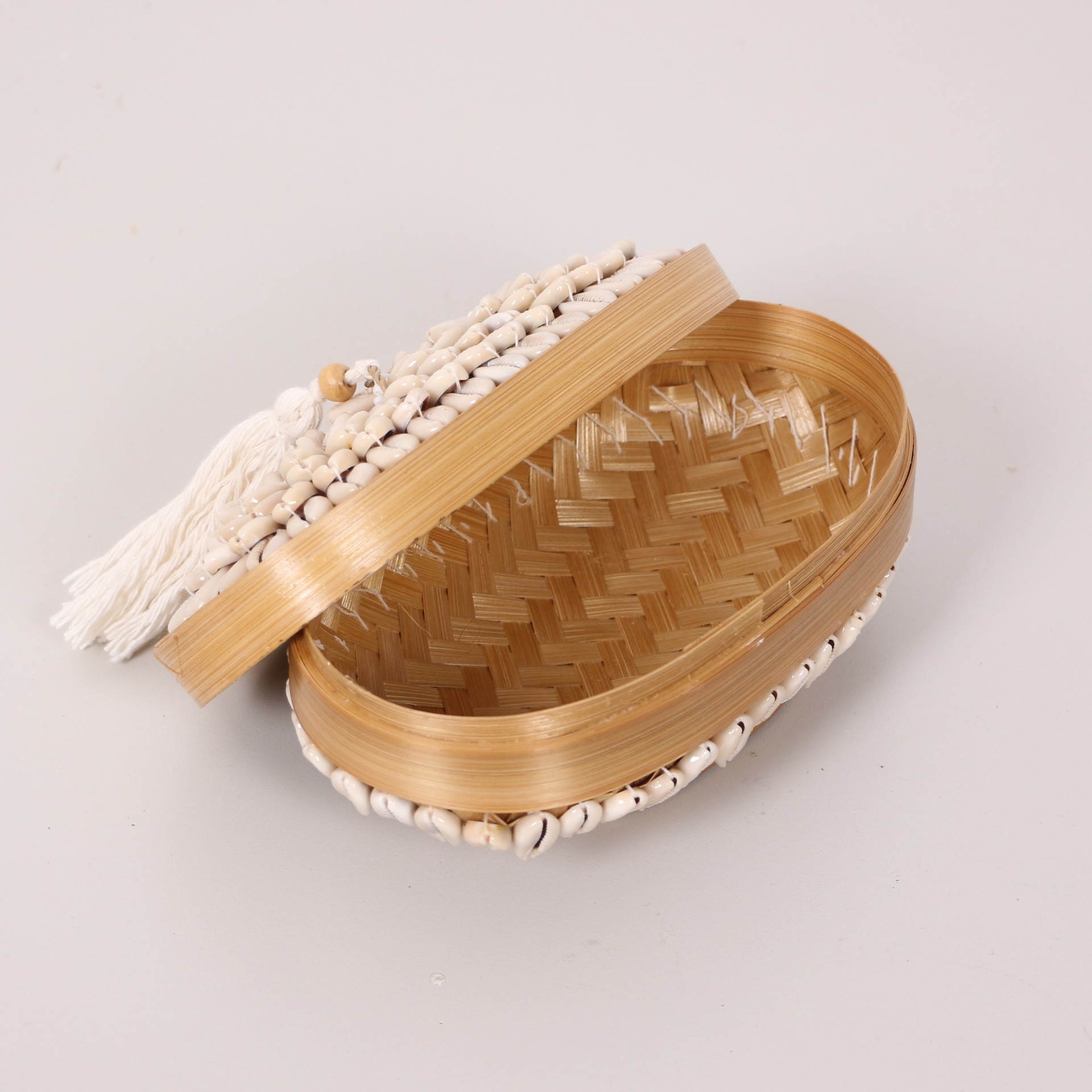 - Doğal Bambunun dış kabuğundan el işçiliği ile örülmüştür. Deniz kabukluları ve Minik Cam boncuklarla farklı desen ve renklerde bambu kutunun üzerinde el işçiliği ile dekor verilerek, kapak kısmında püskülle tamamlanmıştır.