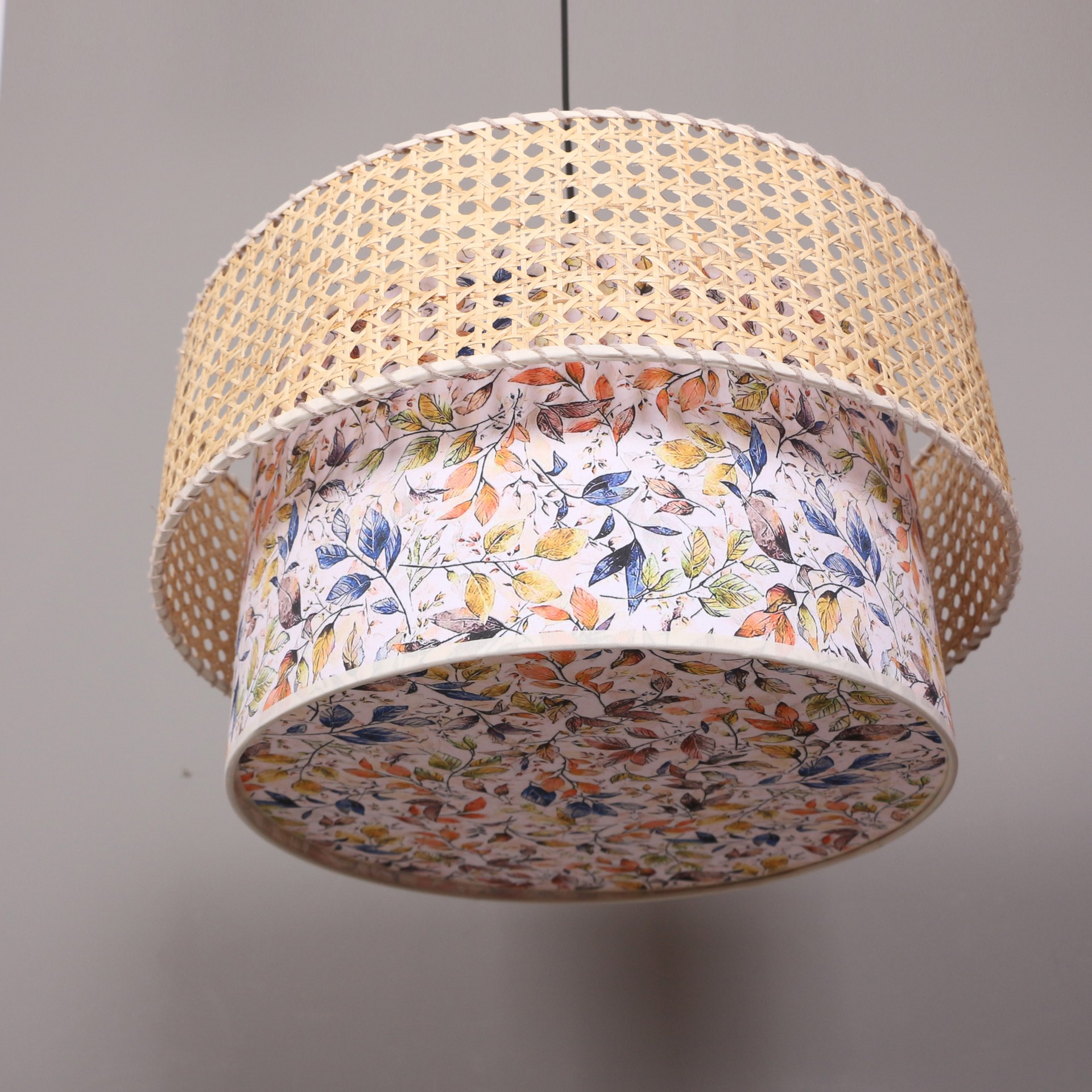 - İmalat Ürünümüz; doğal hazeran malzemeden ve ışık geçirgenliği olan özel baskılı abajur kumaşından, statik boyalı tel üzerine el işçiliği ile üretilmiştir..