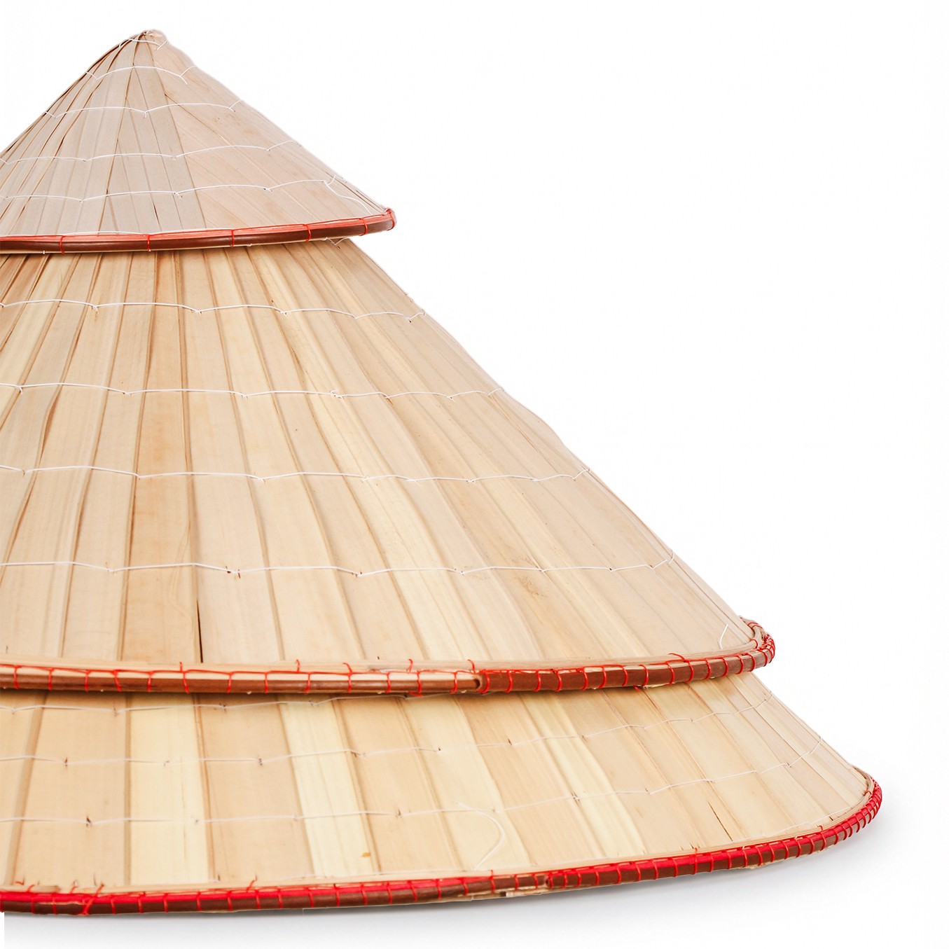ölçülerine sahip üç adet konik şapkadan oluşuyor. Her biri geleneksel tekniklerle işlenmiş, doğal bambu liflerinin tek tek dokunmasıyla hafif ama dayanıklı bir yapı elde edilmiş.