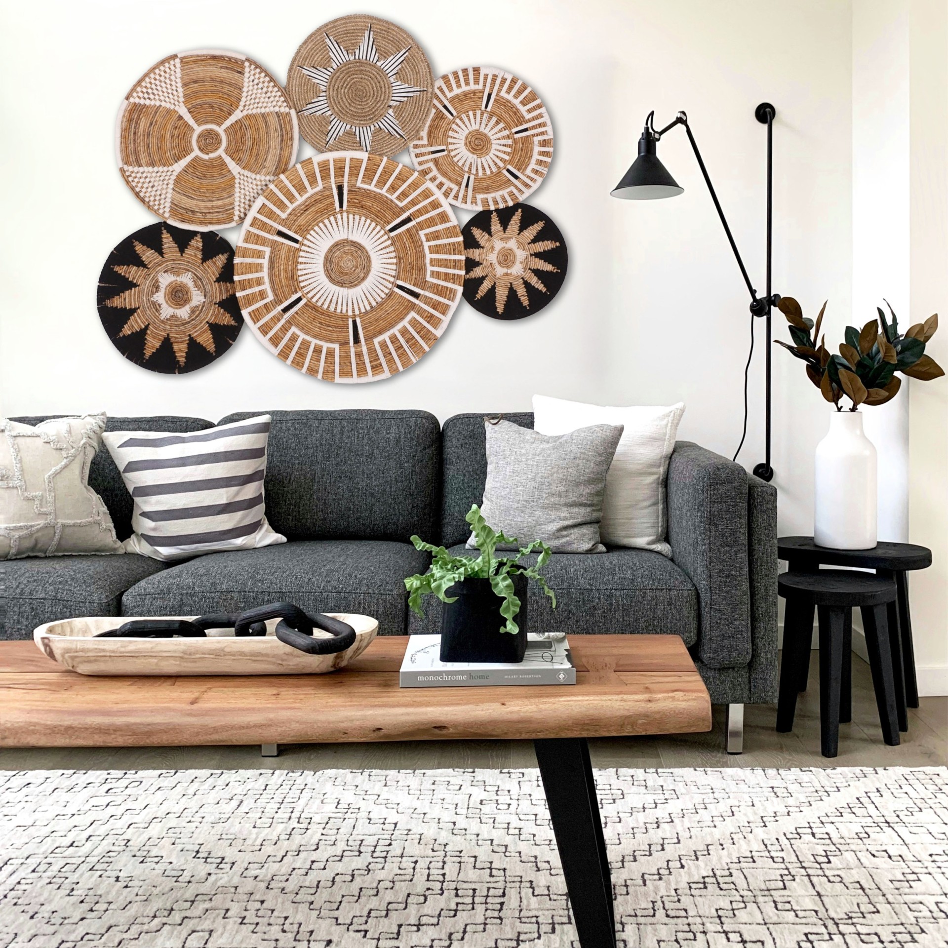 - Ürünümüzün tamamı doğal Abaka bitkisinden zanaatkar ustalarımızca, yine rafya sarılı tabak şeklinde tel kafes üzerine pamuk ipliği ile desen verilerek el işçiliği ile üretilmiştir. Arkasında tel kafese sabit metal askılık ürünün duvarda daha belirgin ve tok durmasını sağlamıştır.
