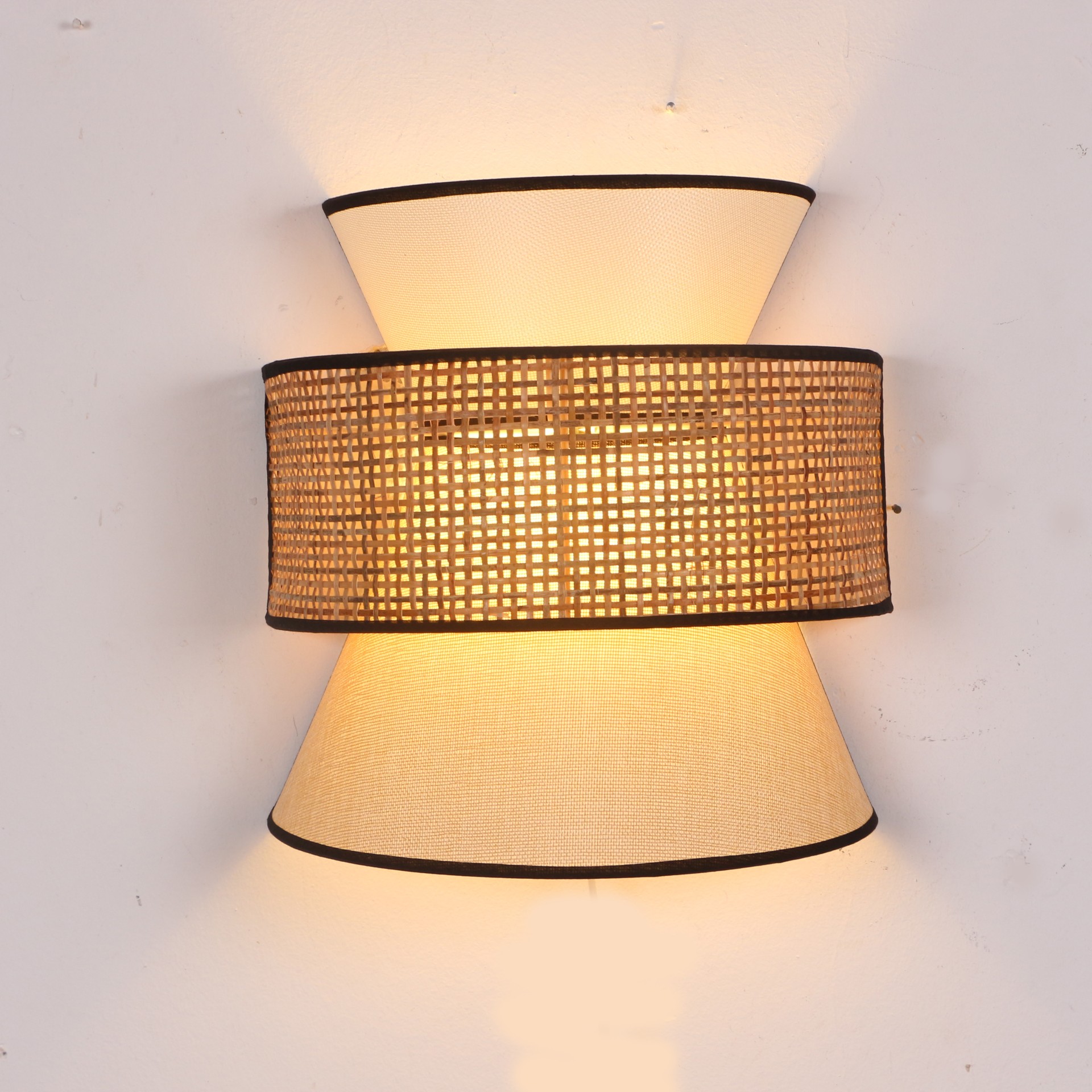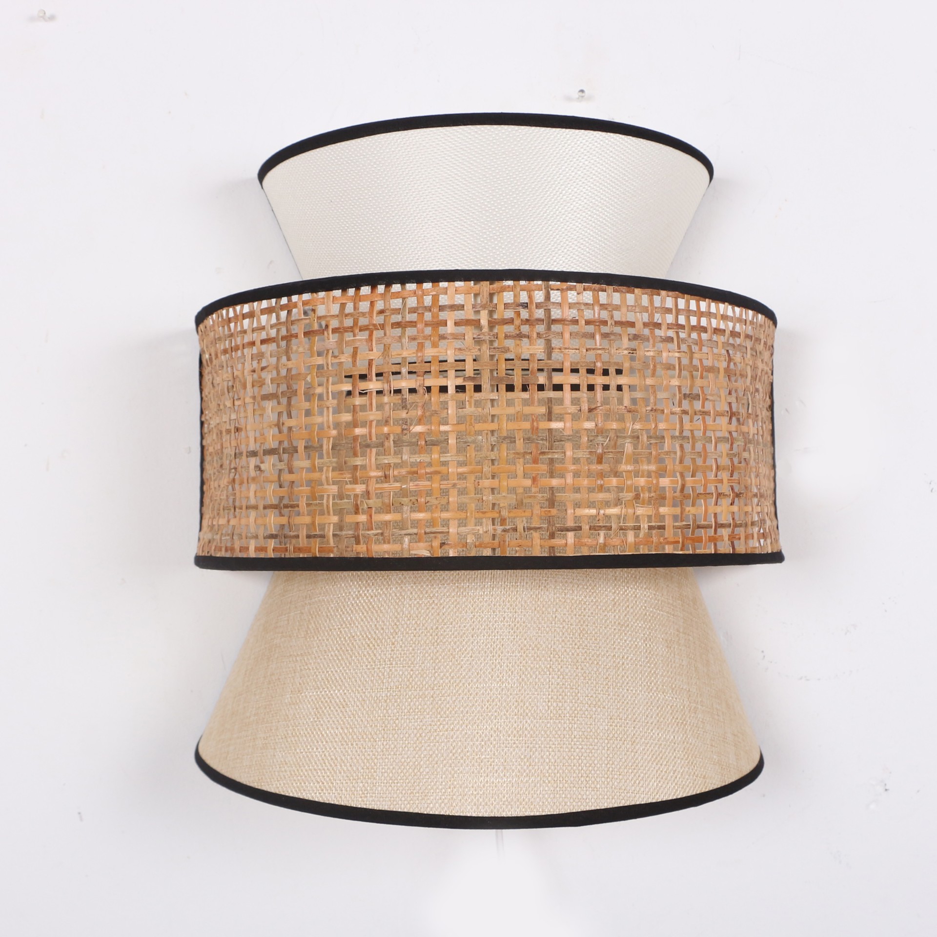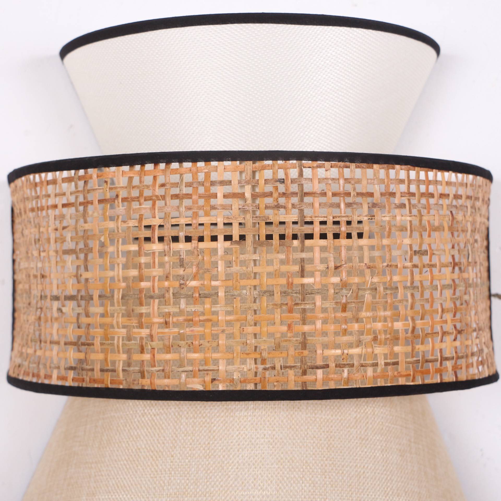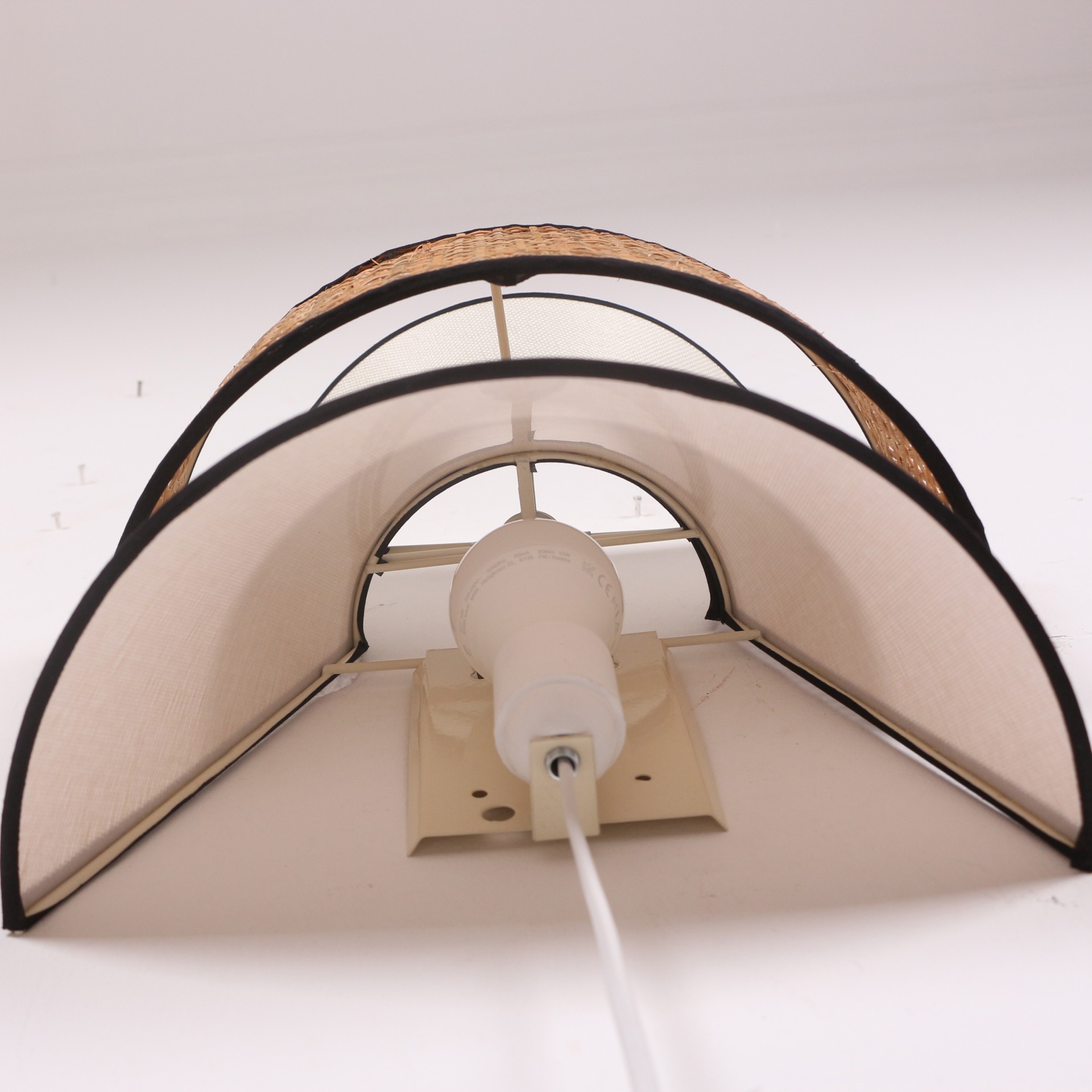 Ürünümüz tabanı Pvc -üstü kumaş kaplı ışık geçirgenliği olan özel abajur kumaşı ve Doğal hazerandan statik boyalı tel üzerine örülmüştür.